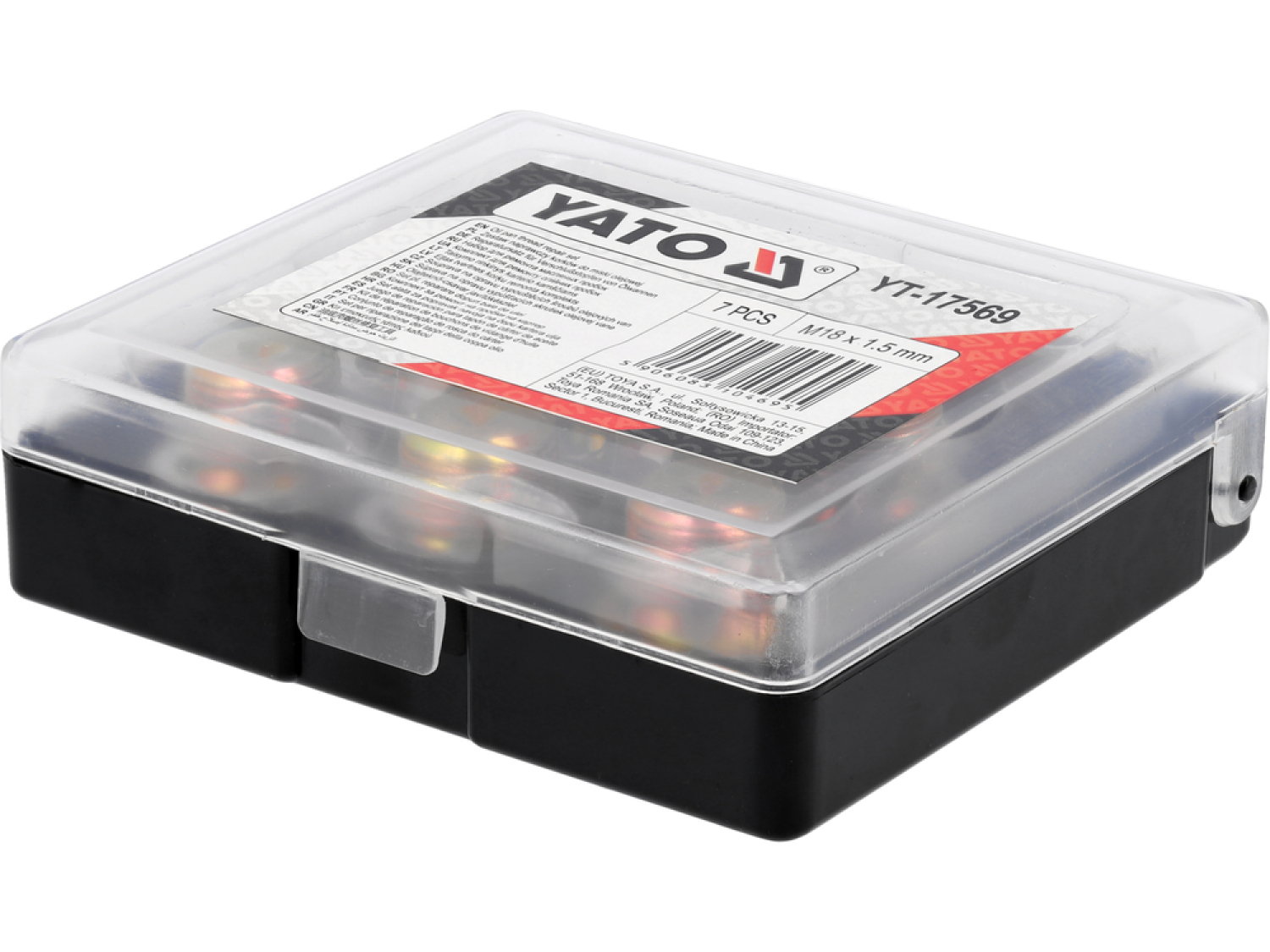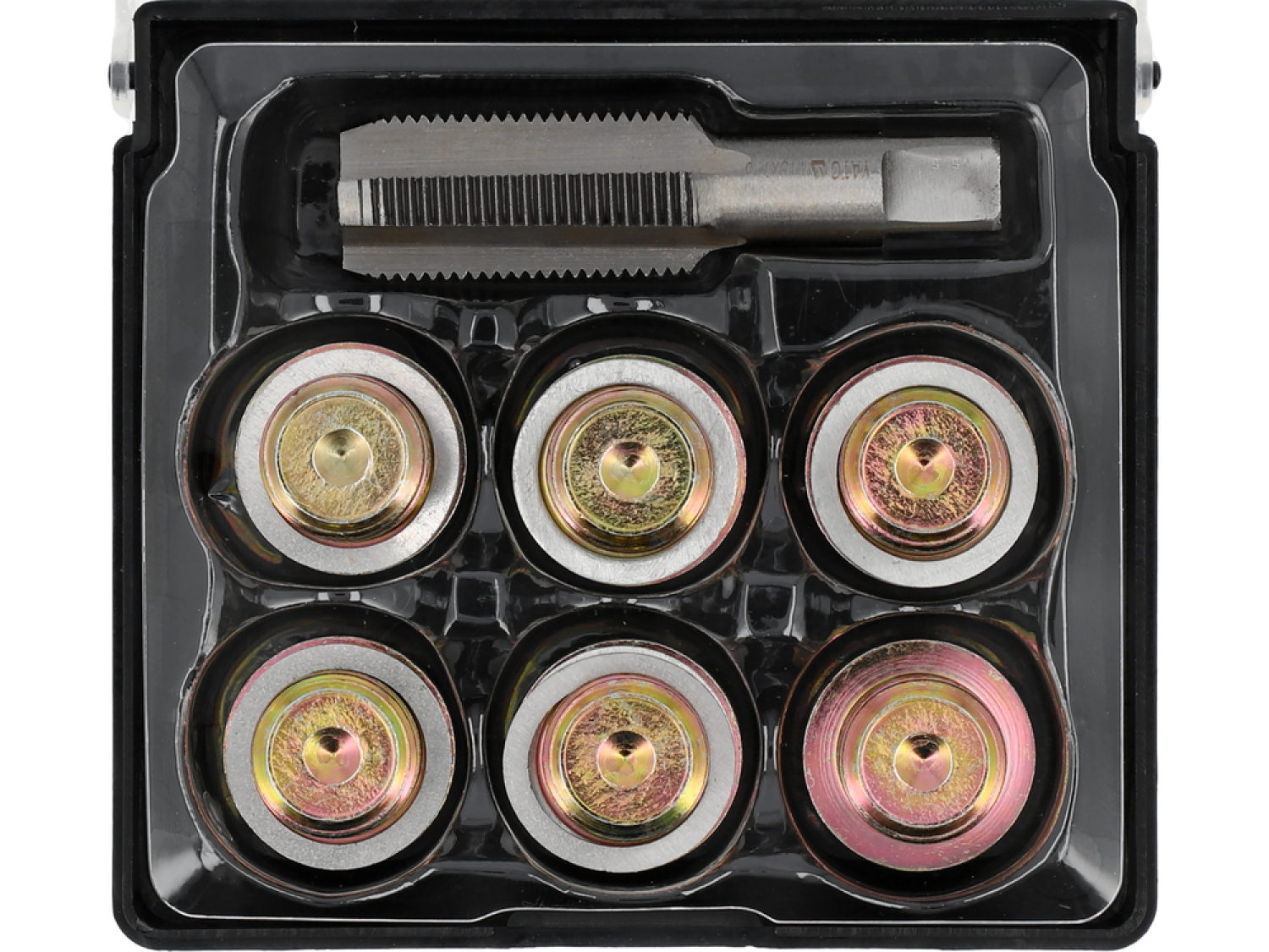 The YATO OIL PAN THREAD REPAIR SET (code: YT-17569) is designed for simple repairs of oil pan drain plug threads, gearboxes, and more. This versatile kit fits most threads commonly used in cars and light trucks.