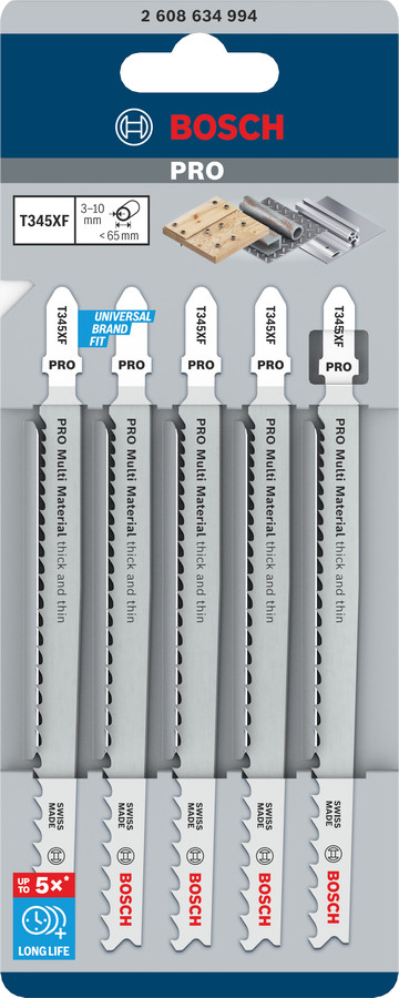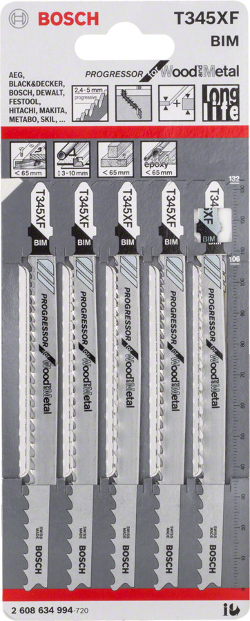 5 figūrzāģa asmeņi T 345 XF (Progressor), Figūrzāģiem PRO MULTI MATERIAL THICK AND THIN T345XF FIGŪRZĀĢA ASMENS, 2608634994, BOSCH