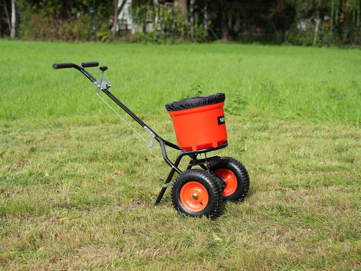 The YATO Rotary Garden Seeder/Spreader YT-86715 is designed for efficient spreading of fertilizers, industrial salt, sand, and other materials. This versatile tool can also be used to sow grass seeds on large and medium-sized areas during the summer. Its soft grip handle and pneumatic wheels ensure user comfort and ease of use. The dosage can be adjusted conveniently via a lever on the handle. A screen and cover are included in the package for added functionality.