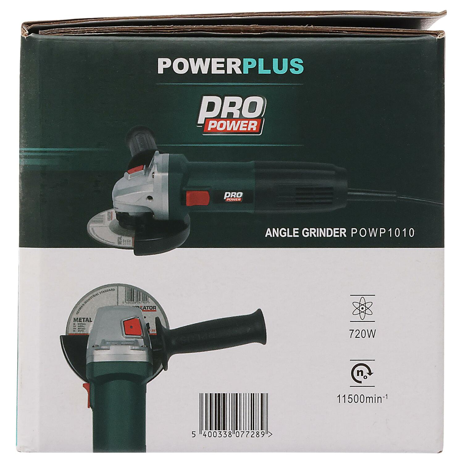 The POWERPLUS Angle Grinder POWP1010 is a powerful 720W tool designed for cutting, grinding, sanding, and deburring metal and stone, as well as rust removal. It features a Ø115 mm disc and a spindle lock to ensure stability during disc installation.