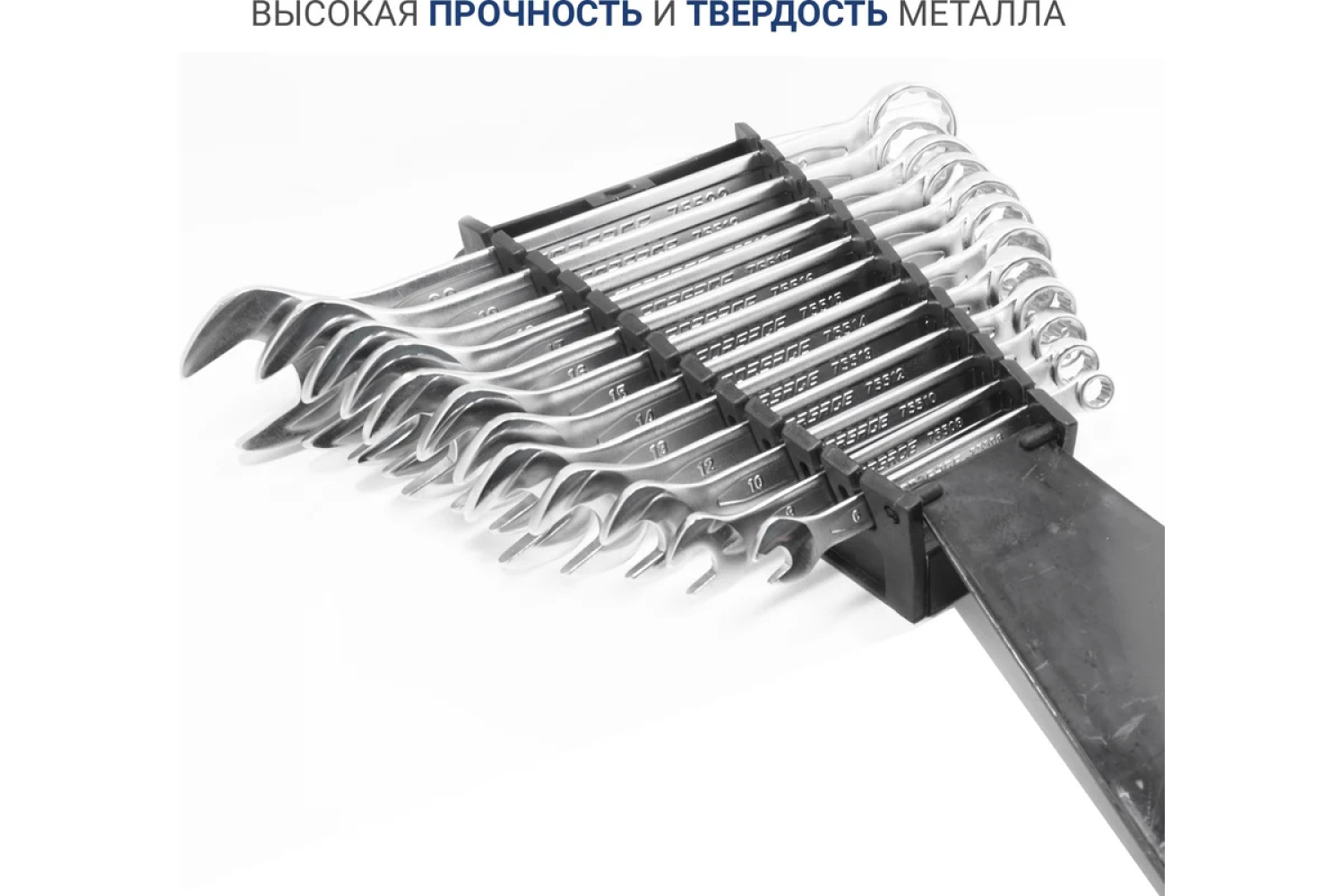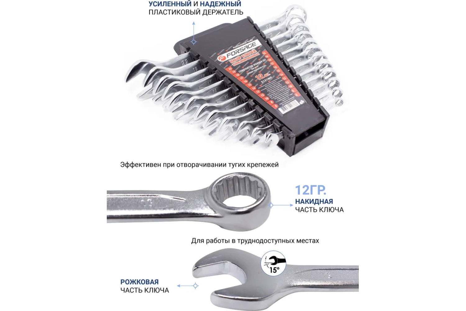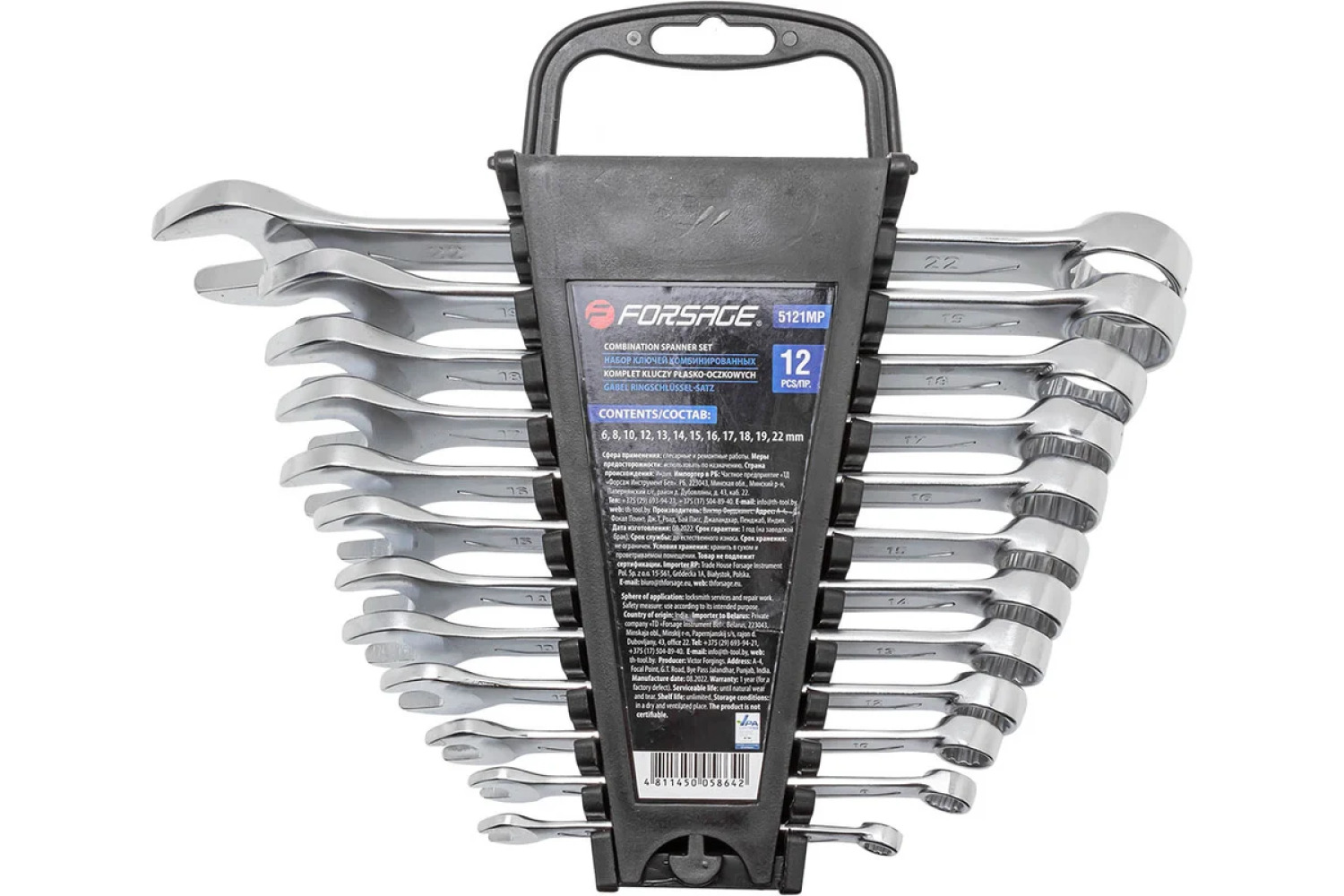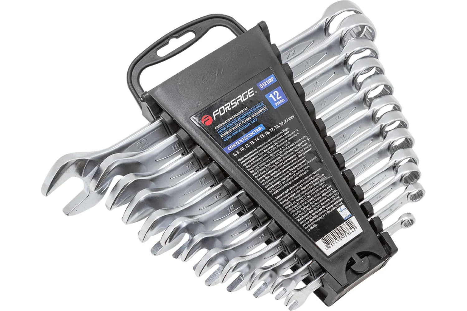 The FORSAGE F-5121MP combined wrench set consists of 12 pieces and is a versatile tool ideal for various mechanical and assembly tasks, combining open-end and box-end profiles of the same size. This design allows for use in the most difficult and confined spaces.