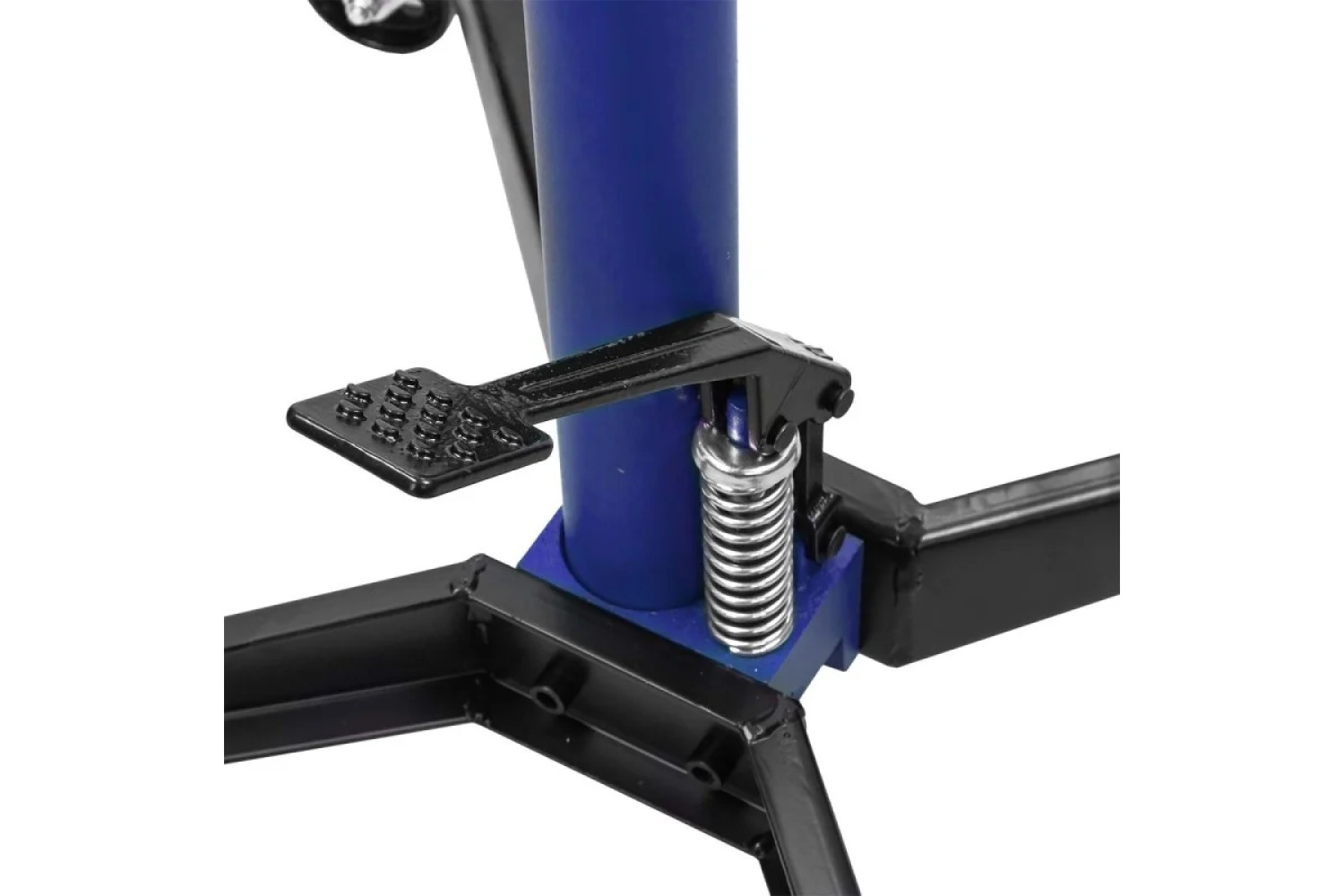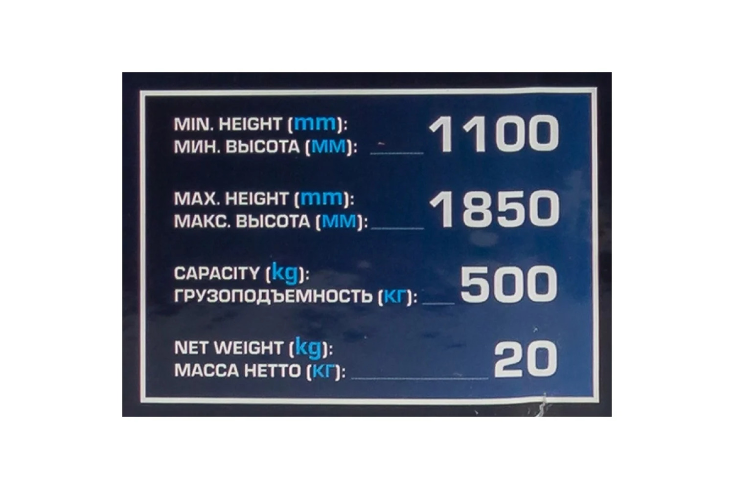 The lifting height can be fixed anywhere from 110 cm to 185 cm, allowing you to easily lift loads up to 500 kg. The lowering speed is easily adjustable. The operation includes lifting with the pedal and lowering with a handle. The net weight of the jack is 20 kg.