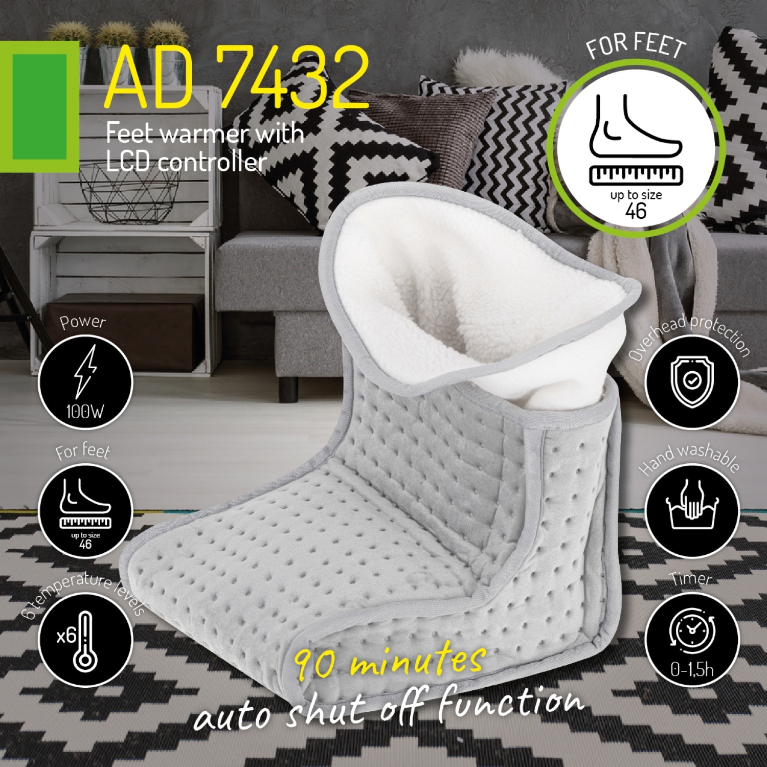 Adler AD7432 is a comfortable and soft foot-warming device with 4 heating levels, an LCD remote controller and an ultra-plush exterior fabric. It is designed to deliver deep, even and pleasant warmth to cold or tired feet, helping to relax muscles after a long day. The removable synthetic wool lining ensures hygienic use — it can be taken out and washed easily, keeping the device clean and pleasant for daily comfort. With 140 W of power, the warmer heats up quickly and maintains a stable temperature throughout the heating session. Designed for one person, it is ideal for use at home, in the office or in relaxation areas.