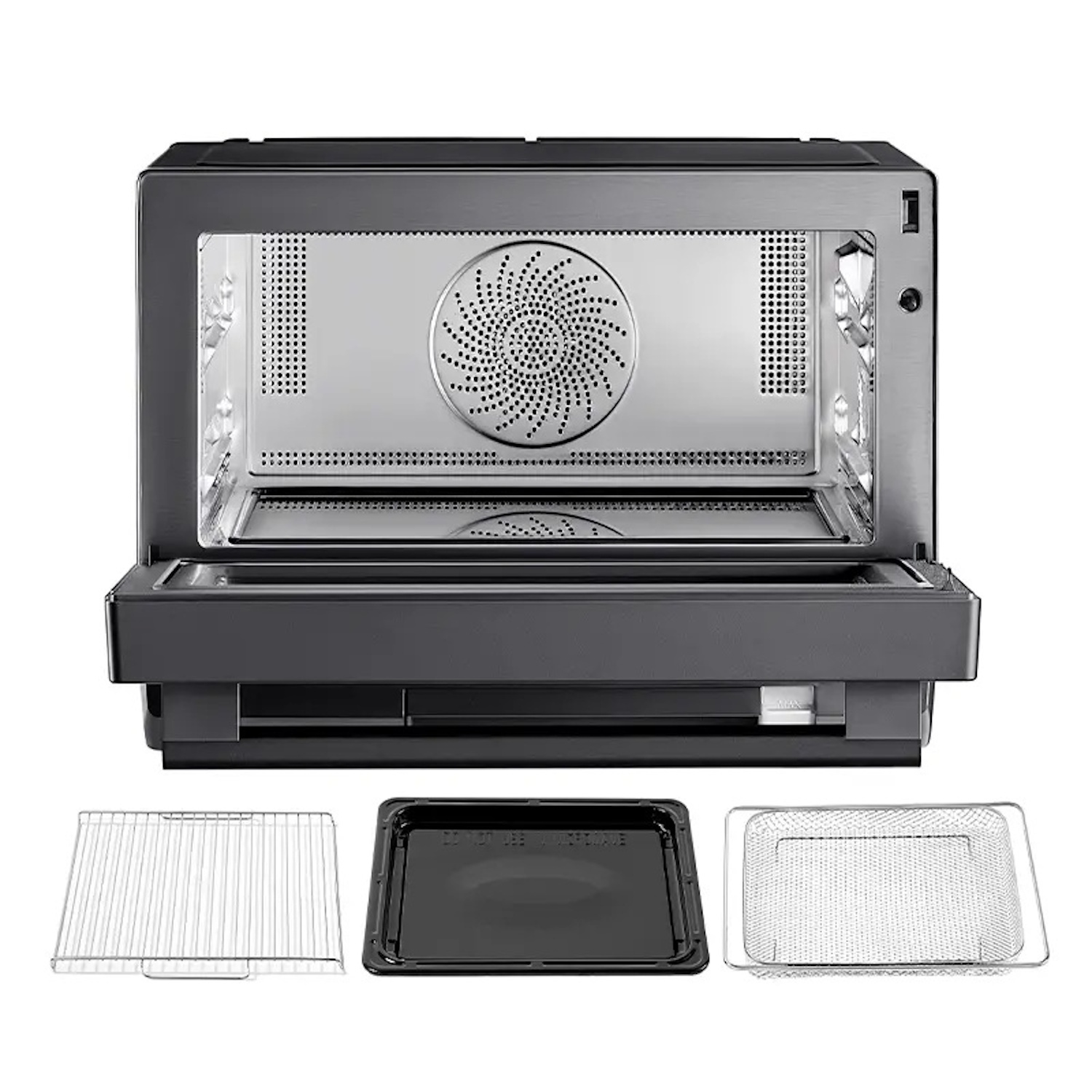 The Midea MSO25H is a freestanding microwave oven with convection and grill functions, combining three cooking technologies in one appliance. Its 25-litre capacity and powerful 1000 W output allow you to cook, bake, reheat and brown food just like in a traditional oven. The premium black design enhances any modern kitchen with a sleek and elegant look.