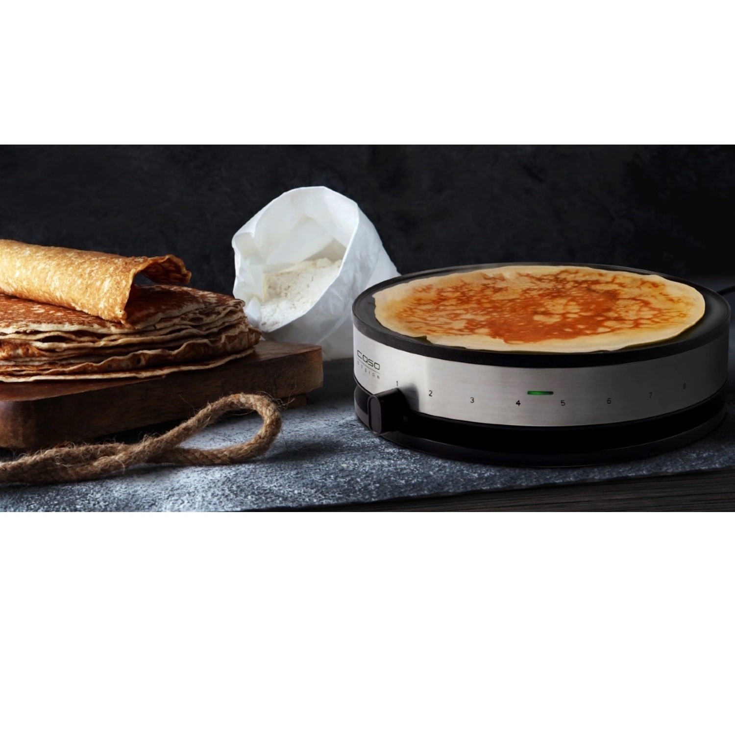 The Caso CM 1300 is a modern and powerful electric crepe maker with 1300W of power and a wide 33 cm cooking surface. It is designed to deliver perfect thin crepes, tortillas, tacos, lavash and other flat dough products. The appliance features 8 temperature levels, a high-quality ILAG non-stick coating, a stainless-steel housing and practical accessories for convenient cooking. Suitable for daily use as well as intensive family cooking.