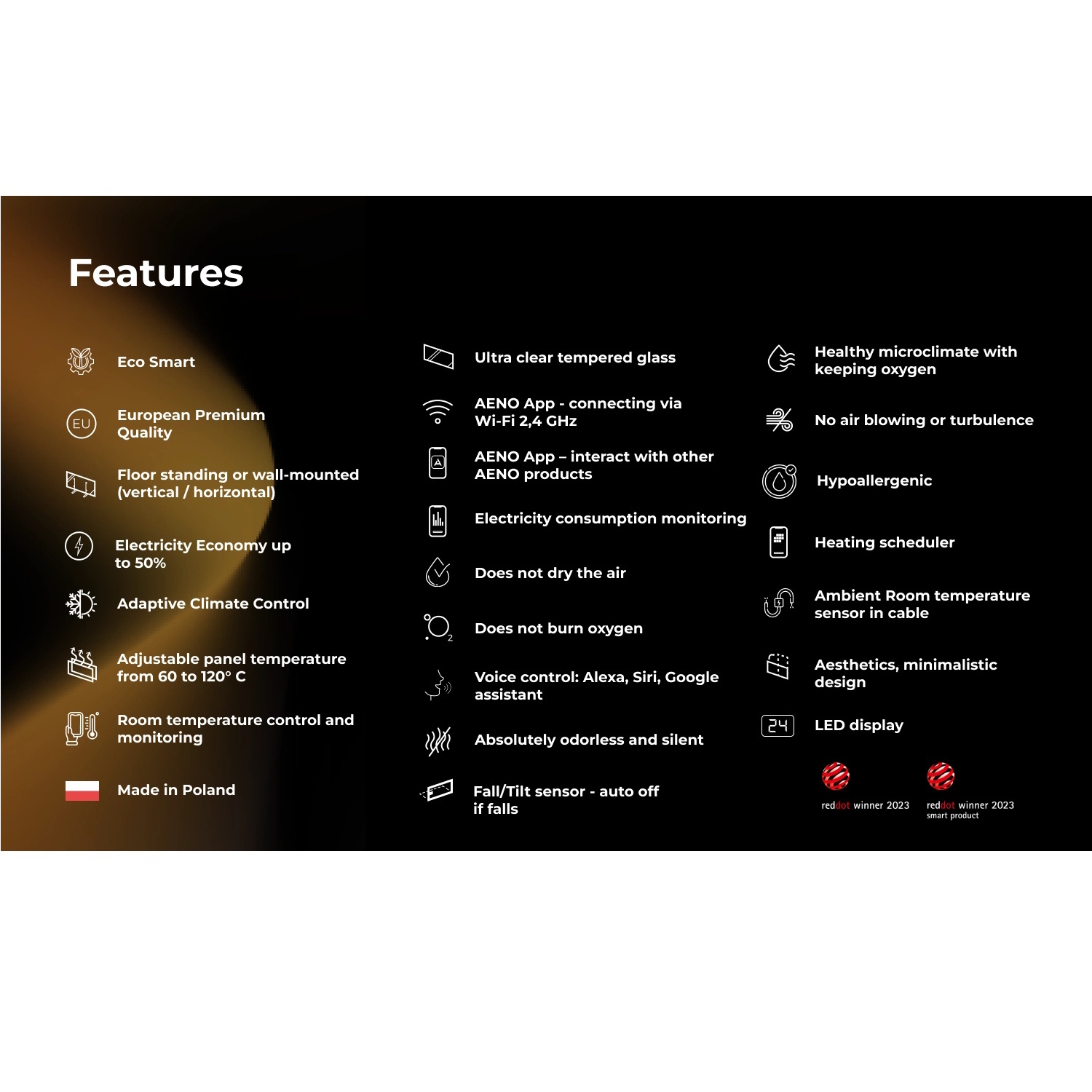 AENO is an international modern home-appliance brand specialising in smart heating and climate solutions. The brand combines energy efficiency, safety and contemporary design, creating devices that integrate naturally into today’s living spaces.