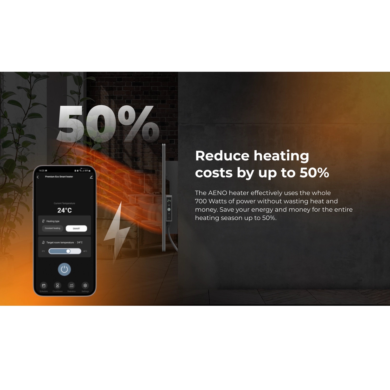 Smart control via the AENO app — manage temperature, schedules and modes remotely.