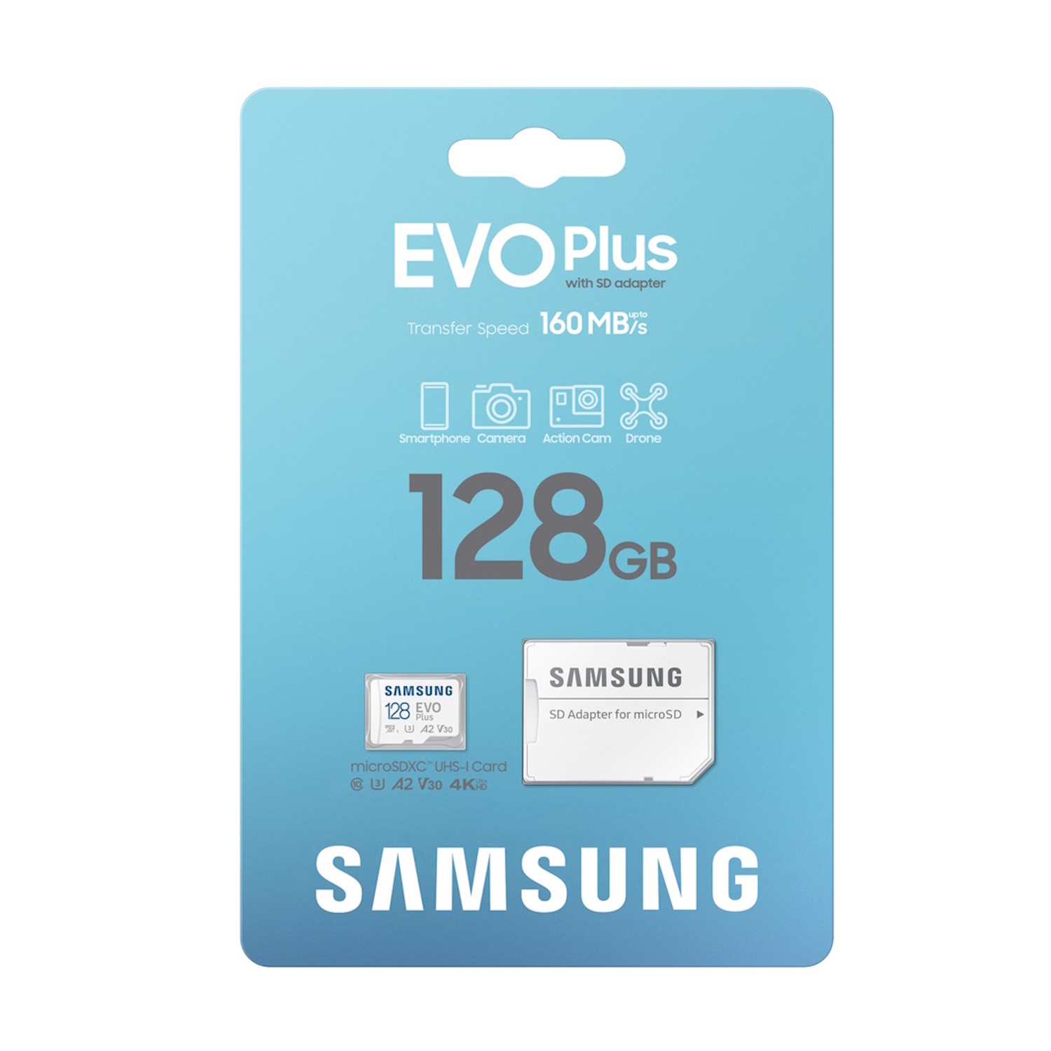 Samsung EVO Plus 128 GB microSDXC is a versatile and fast memory card with an SD adapter, providing ample storage capacity, stable performance, and excellent compatibility across a wide range of devices. With UHS-I U3 / V30 / A2 classification, it is ready for intensive 4K video recording, app usage, and data processing on smartphones, cameras, tablets, and drones.