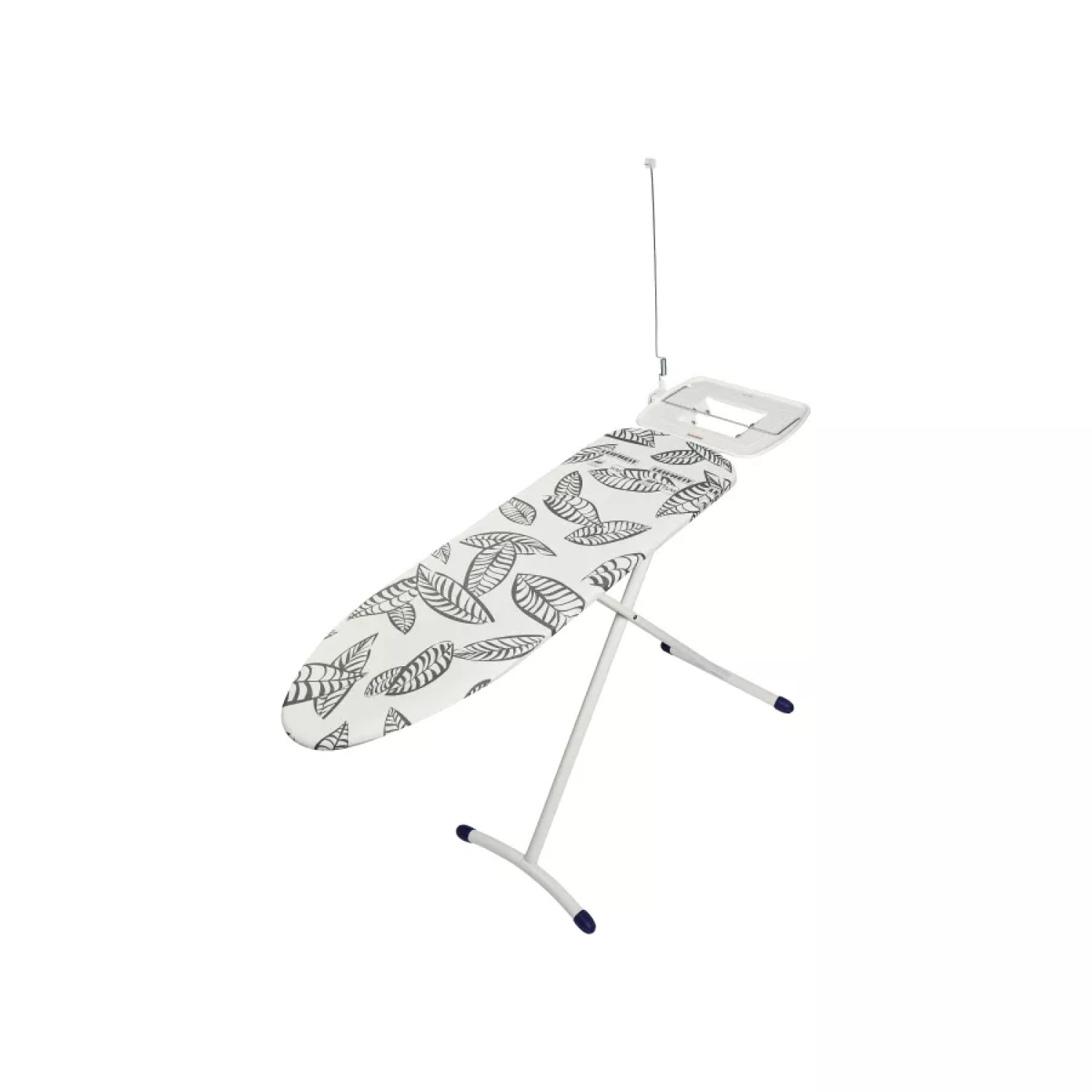It features a fixed tray for placing the iron with a cord holder, perfectly sized for steam ironing systems (36.5 x 27 cm). Additionally, a fixed clothes hanger holder is included. The ironing board is height adjustable up to 98 cm.