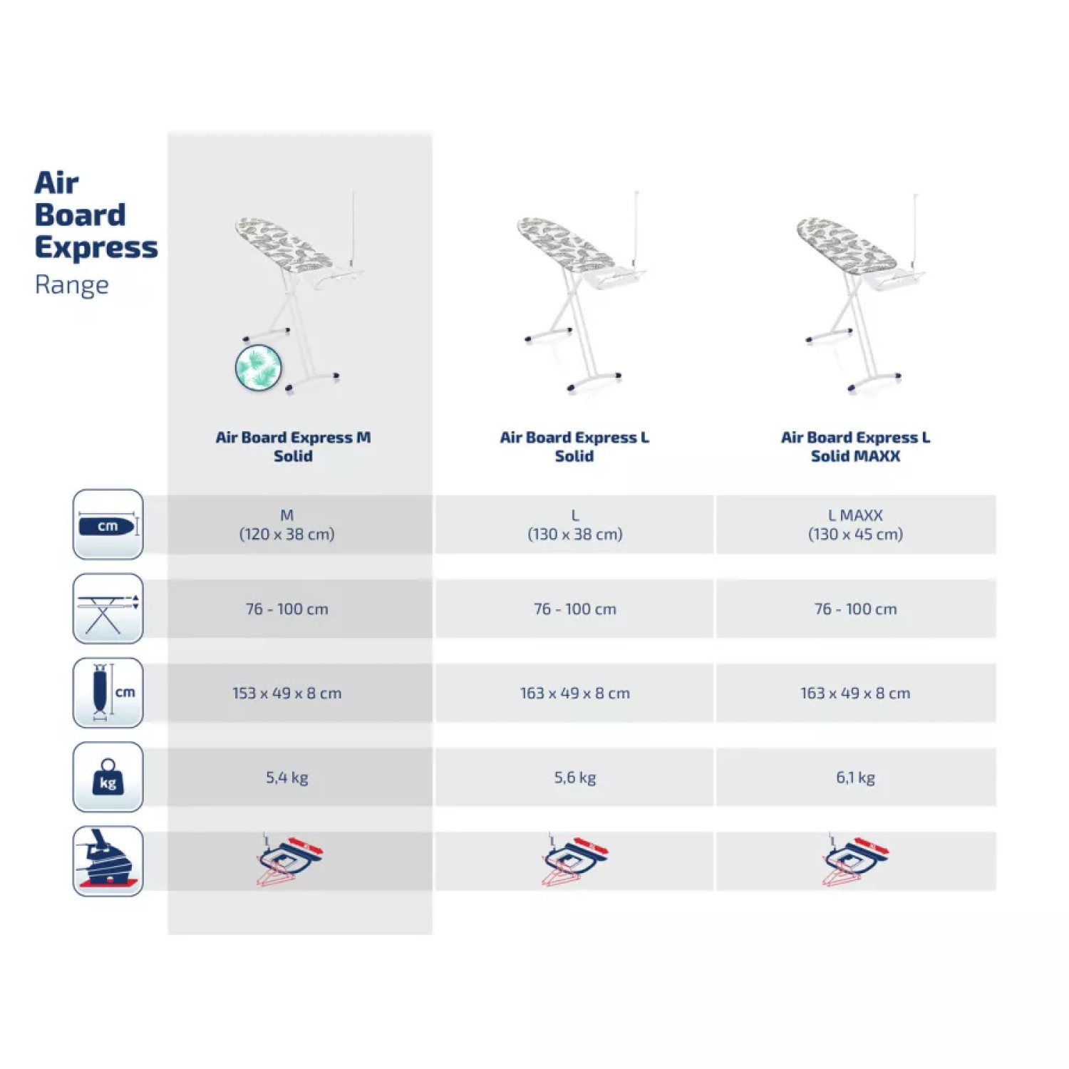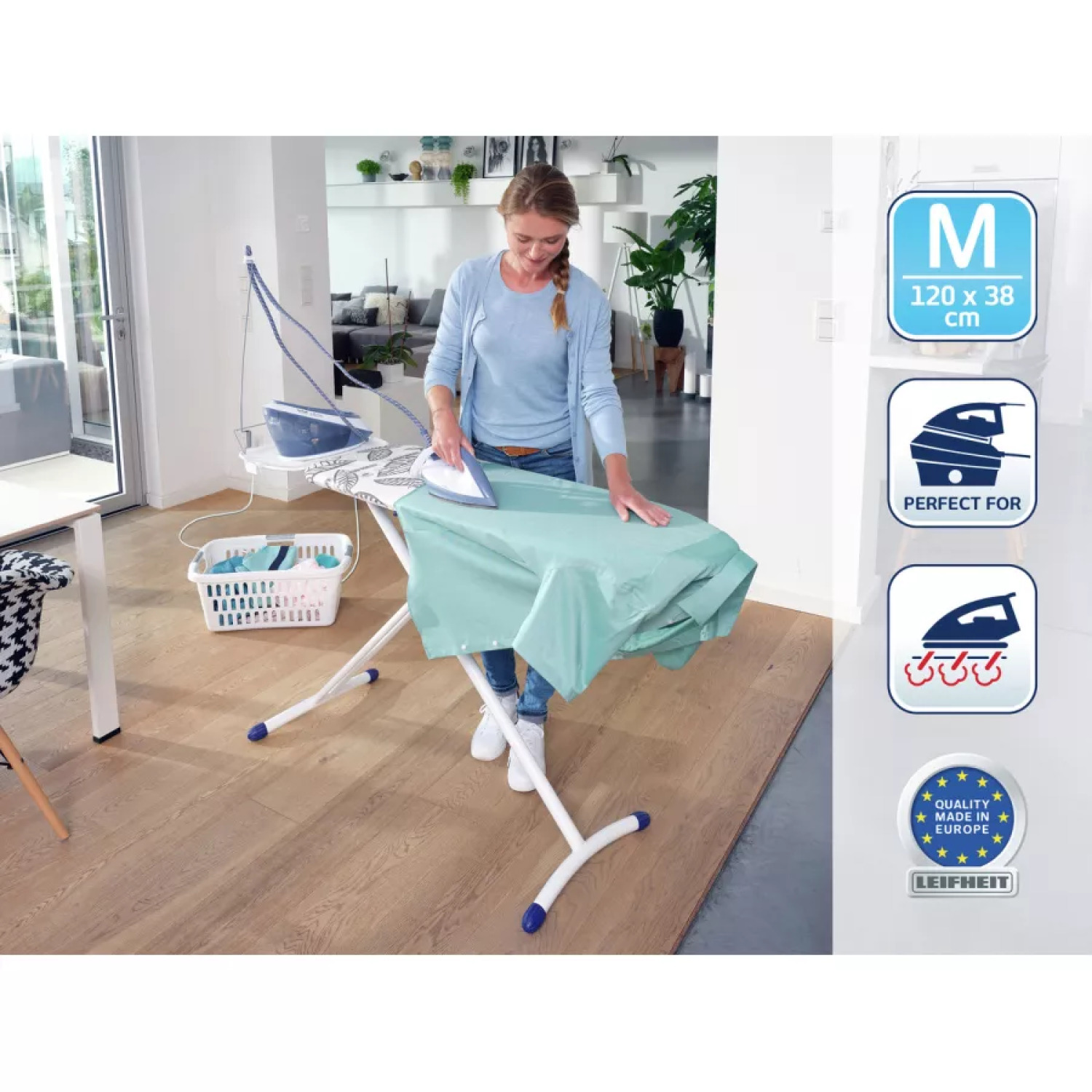 The LEIFHEIT Air Board Express M Solid ironing board (model code: 1072565) is extremely lightweight, considerably lighter than standard plastic and steel boards. The ironing surface is crafted from EPP, a specially developed, ultra-lightweight and durable plastic material that makes this board at least 25% lighter than similar models! This lighter design allows for easier handling, positioning, and maneuverability, particularly for individuals with limited mobility. The extra light ironing surface measures 120 x 38 cm.