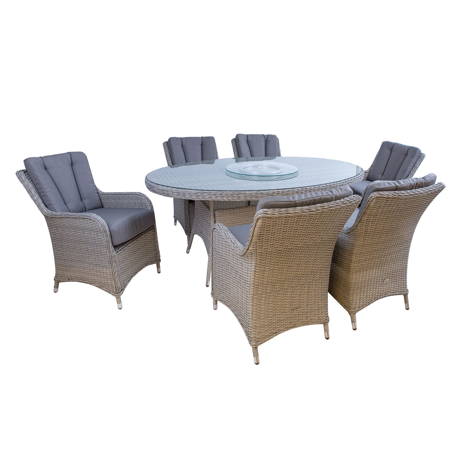 Garden furniture set ASCOT table and 6 chairs. The dimensions of the table are 180x120xH75cm. The frames of the table and chairs are made of aluminum and covered with grey plastic wicker. Tabletop: 8mm tempered clear glass. Rotating serving tray D60cm, made of clear glass includes to the set. In the middle of the table and serving tray is a hole (D4cm) for the parasol. The dimensions of the armchair are 58x70xH90cm. Seat width 48cm, seat depth 49cm, seat height with cushion 54cm. The height of the armrest from the ground is 66cm. Cushions are included. The cushion covers are made of gray polyester fabric. The dimensions of the seat cushion are 48x49xH13cm, the dimensions of the backrest cushion are 50x45x5cm. Product is durable in changing weather conditions and very easy to maintain, only cushions need protection from the weather conditions. To prolong the lifespan of outdoor furniture, we recommend the use of outdoor furniture covers. STORAGE: at the end of the summer season, we recommend storing the garden furniture indoors. Clean and dry the furniture before storing. Use a dry, well-ventilated room for storage.