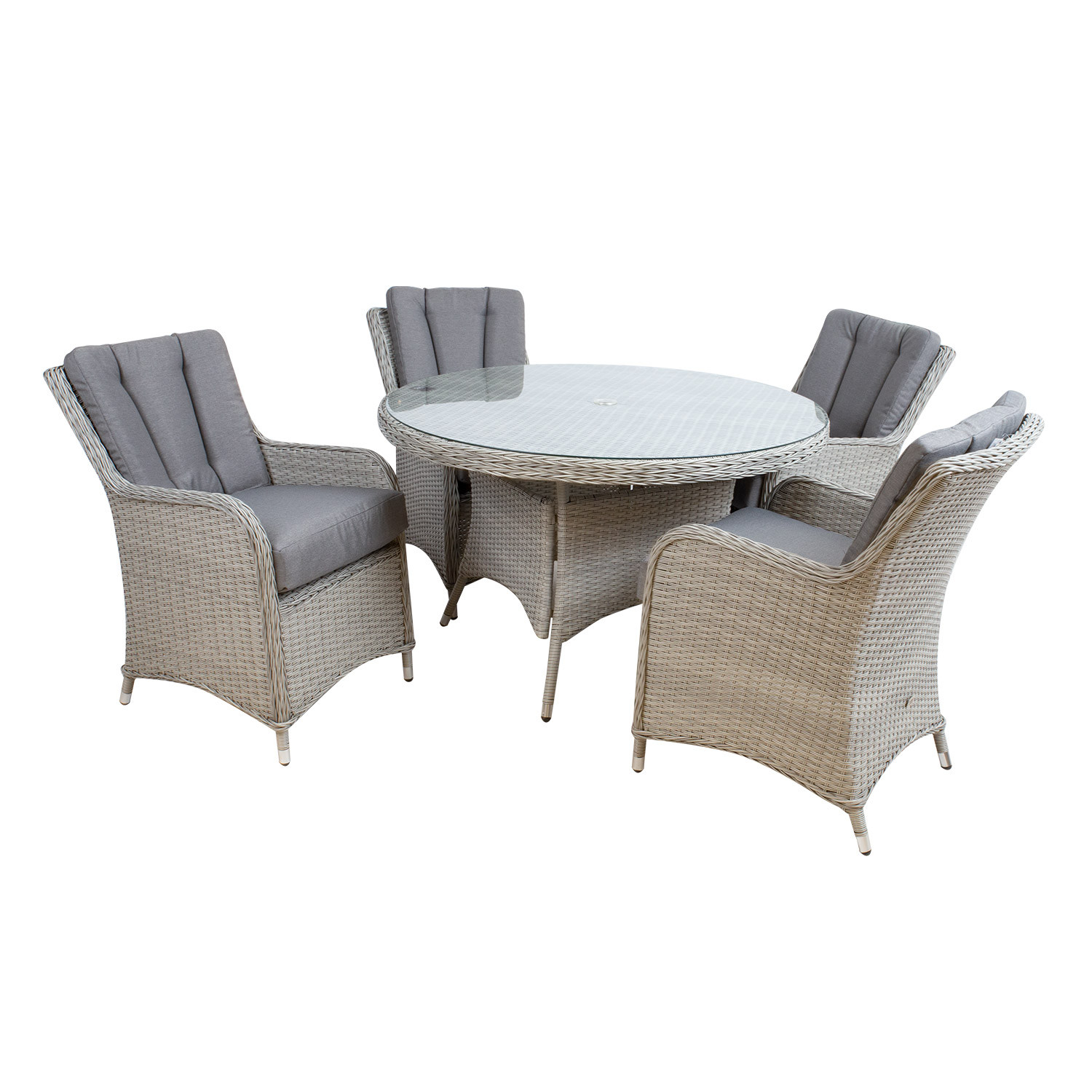 Garden furniture set ASCOT table and 4 chairs. The dimensions of the table are D121xH75cm. The frames of the table and chairs are made of aluminum and covered with grey plastic wicker. Tabletop: 8mm tempered clear glass. In the middle of the table is a hole (D4cm) for a parasol. The dimensions of the armchair are 58x70xH90cm. Seat width 48cm, seat depth 49cm, seat height with cushion 54cm. The height of the armrest from the ground is 66cm. Cushions are included. The cushion covers are made of gray polyester fabric. The dimensions of the seat cushion are 48x49xH13cm, the dimensions of the backrest cushion are 50x45x5cm. Product is durable in changing weather conditions and very easy to maintain, only cushions need protection from the weather conditions. To prolong the lifespan of outdoor furniture, we recommend the use of outdoor furniture covers. STORAGE: at the end of the summer season, we recommend storing the garden furniture indoors. Clean and dry the furniture before storing. Use a dry, well-ventilated room for storage.