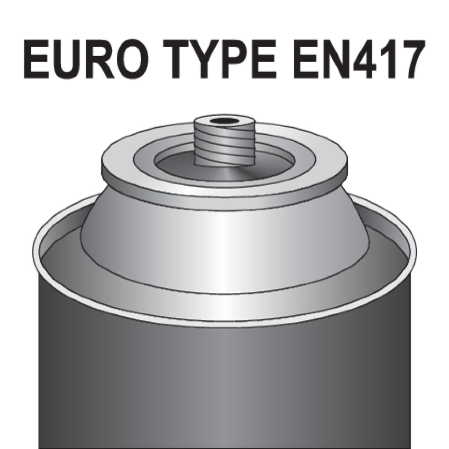 The burner is compatible with disposable containers equipped with a self-sealing threaded connector that conforms to EN 417 standards.