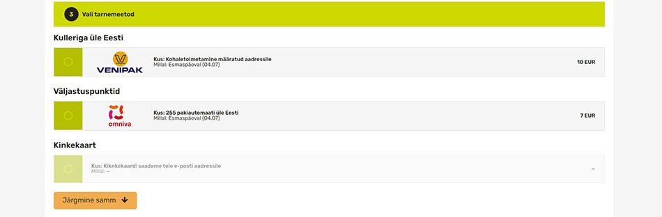 - Kui toode mahub pakiautomaati, siis saad valida endale sobiva pakiautomaadi, kuhu kaup toimetatakse.