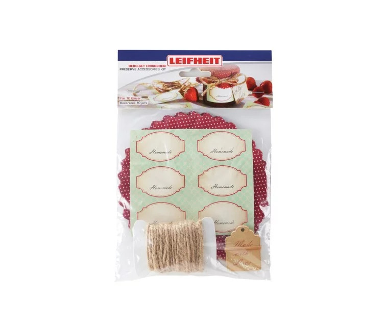 Kas gali būti maloniau už rankų darbo dovaną - su meile supakuotą ir gražiai dekoruotą? Leifheit stiklainių dekoravimo rinkinys siūlo viską, kas yra reikalinga papuošti jūsų naminę uogienę ir sukurti gražią dovaną. Į rinkinį įeina sveikinimo atvirukas, leidžiantis pridėti laimingam gavėjui skirtą asmeninį sveikinimą ar pasveikinimą. Rinkinyje yra 10 etikečių lipdukų, 10 sveikinimo atvirukų, 10 medvilninių dekoratyvinių dangtelių su ąselėmis, 10 guminių ir natūralaus pluošto raištelių.
