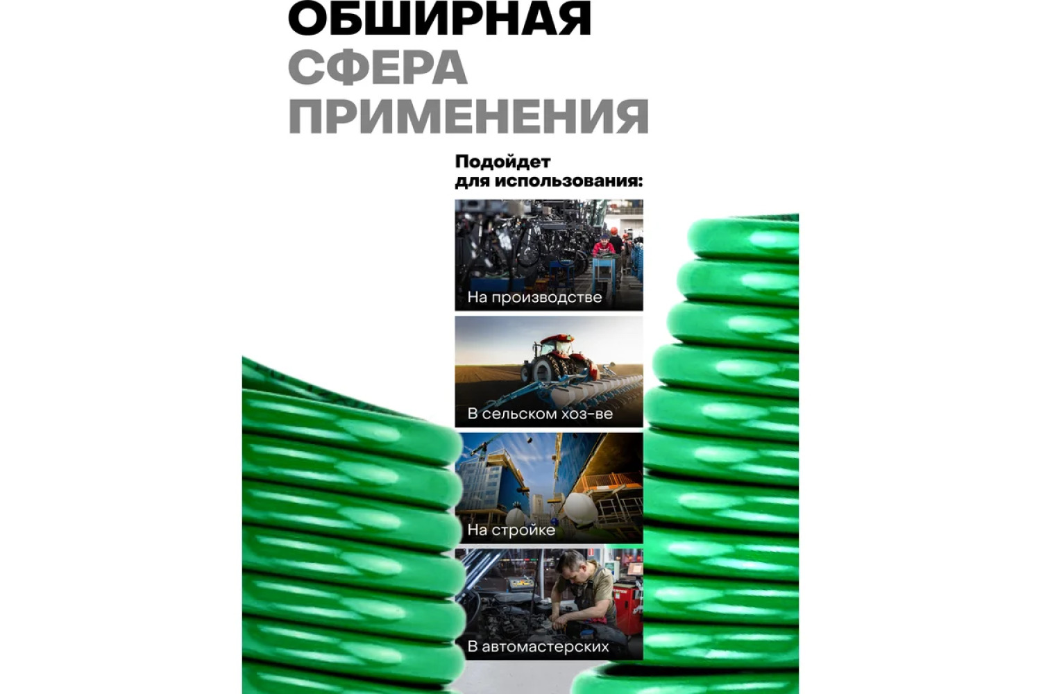 Patikimas naudojimas. Sriegta žarna yra lanksti, išvengiant susipynimo ar apsisukimo, todėl ji yra ilgaamžė. Žarnai prijungti iš abiejų galų yra mosiniai srieginių galai 1/2" išorinis sriegis. Didžiausias leidžiamas slėgis yra 15 barų. Darbo temperatūros intervalas yra nuo -20° iki +60°. Žarna yra 10 metrų ilgio, leidžianti dirbti optimaliai toli nuo pneumatinio įrenginio, taip suteikiant pakankamą judėjimo laisvę ir lankstumą be apribojimų.