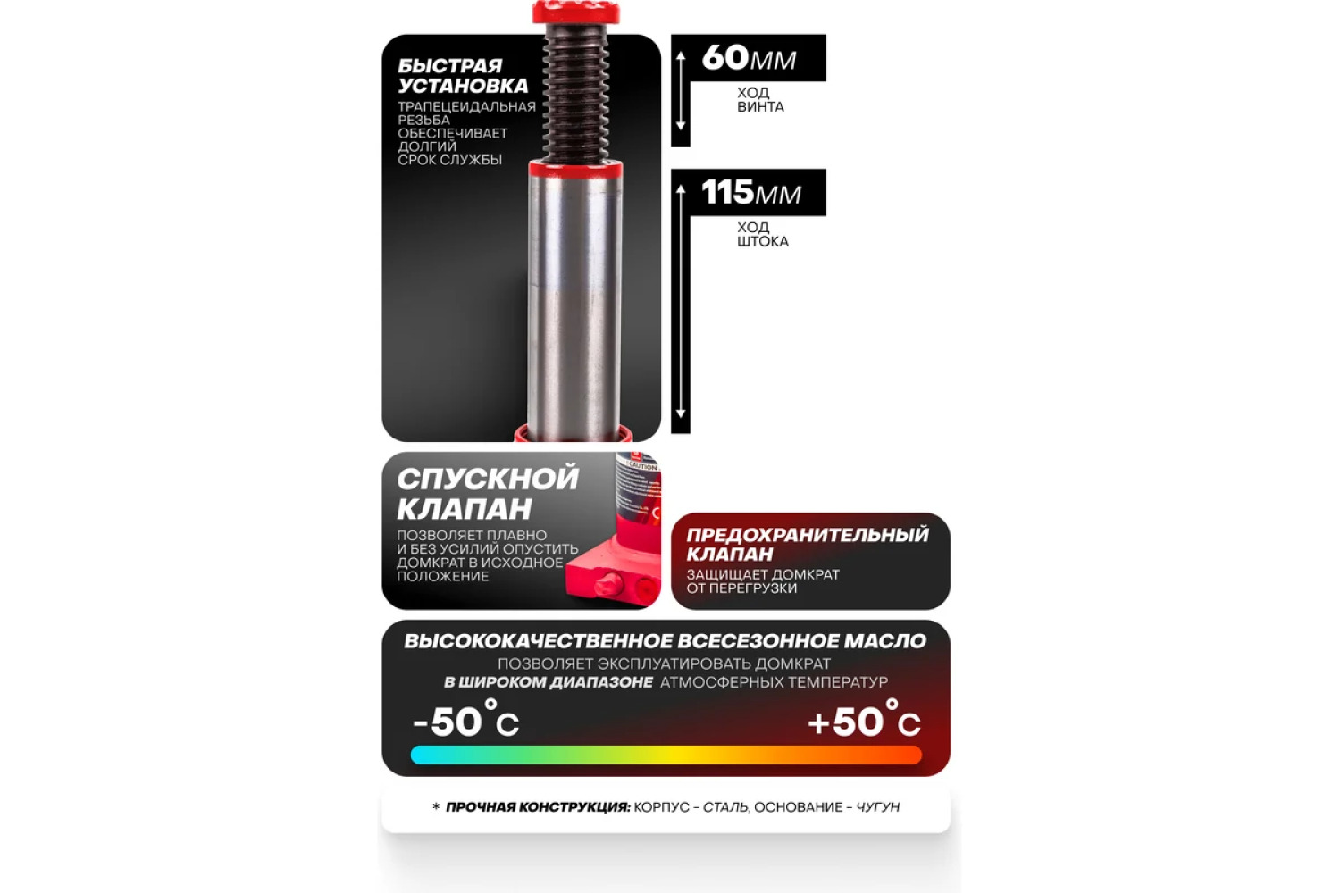Platus temperatūrų diapazonas: Hidraulinis alyva veikia temperatūroje nuo -50 °C iki +50 °C, todėl domkratas yra universalus įvairiomis klimato sąlygomis.