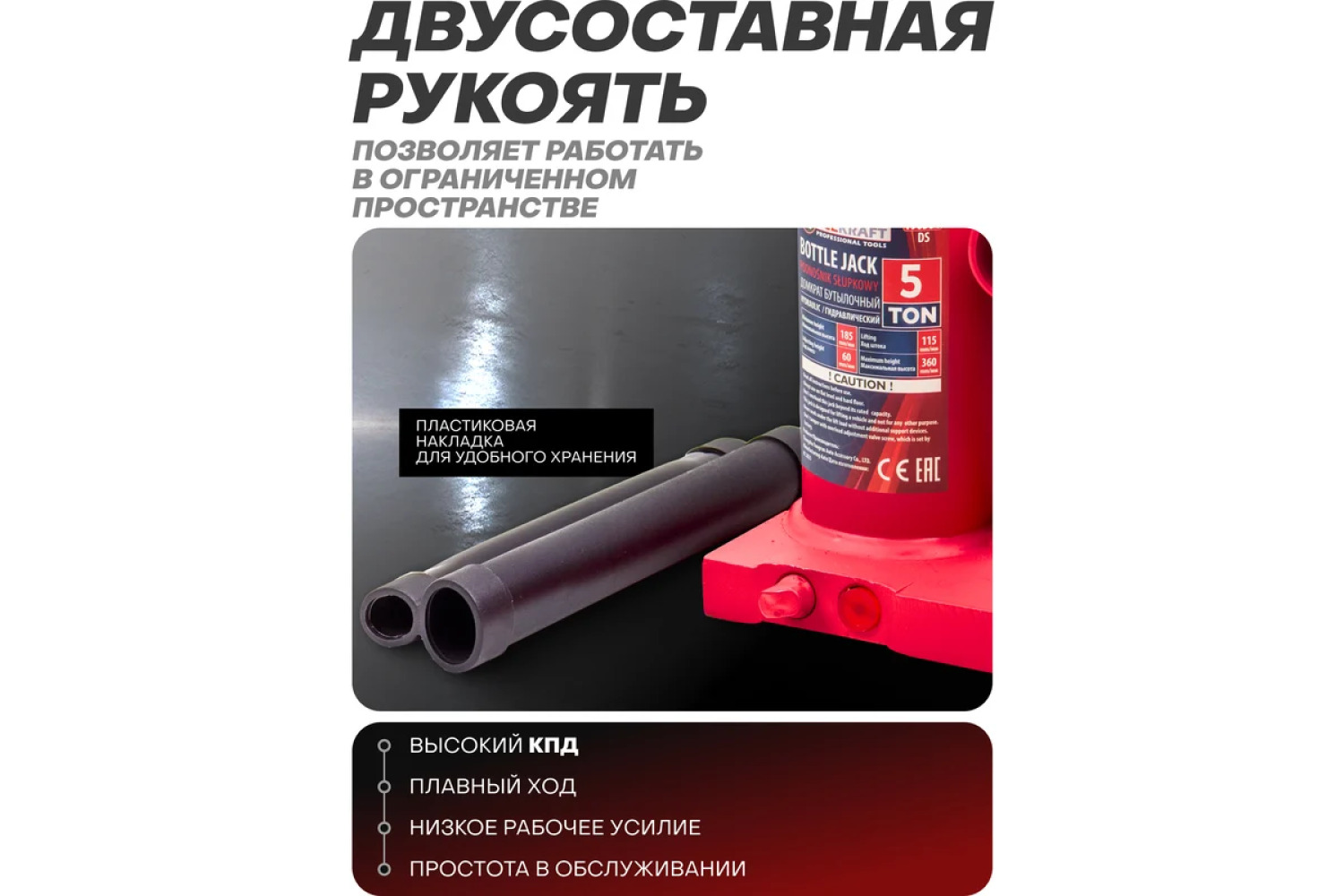 Kompaktiškas dydis: Dėl mobilumo ir lengvo transportavimo, domkratą patogu saugoti ir naudoti bet kokiomis sąlygomis.