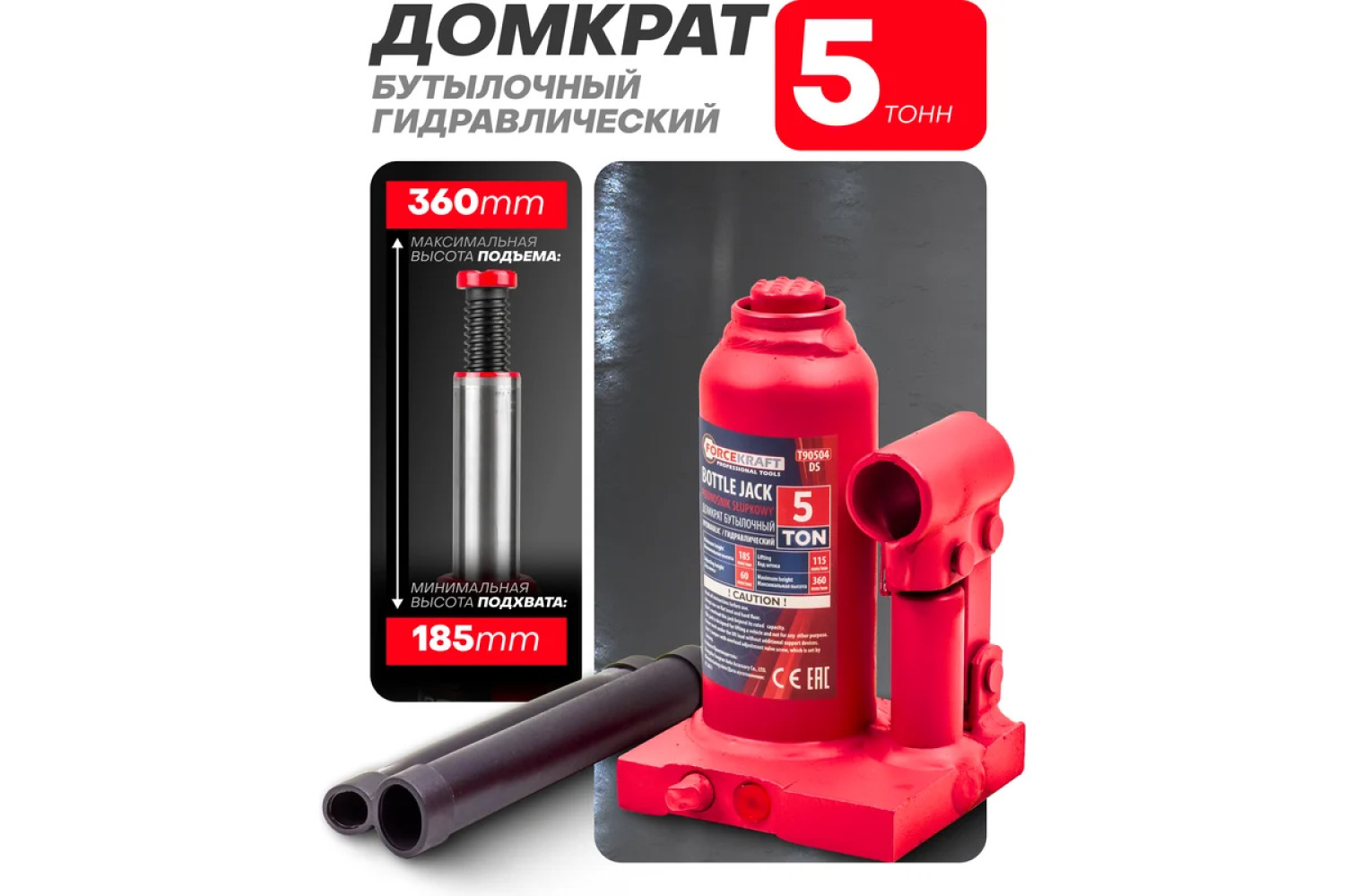 Hidraulinis butelinis domkratas, Forcekraft, FK-T90504, 5 t, 360 mm kėlimo aukštis, 185 mm mažiausias aukštis, apsauginis vožtuvas