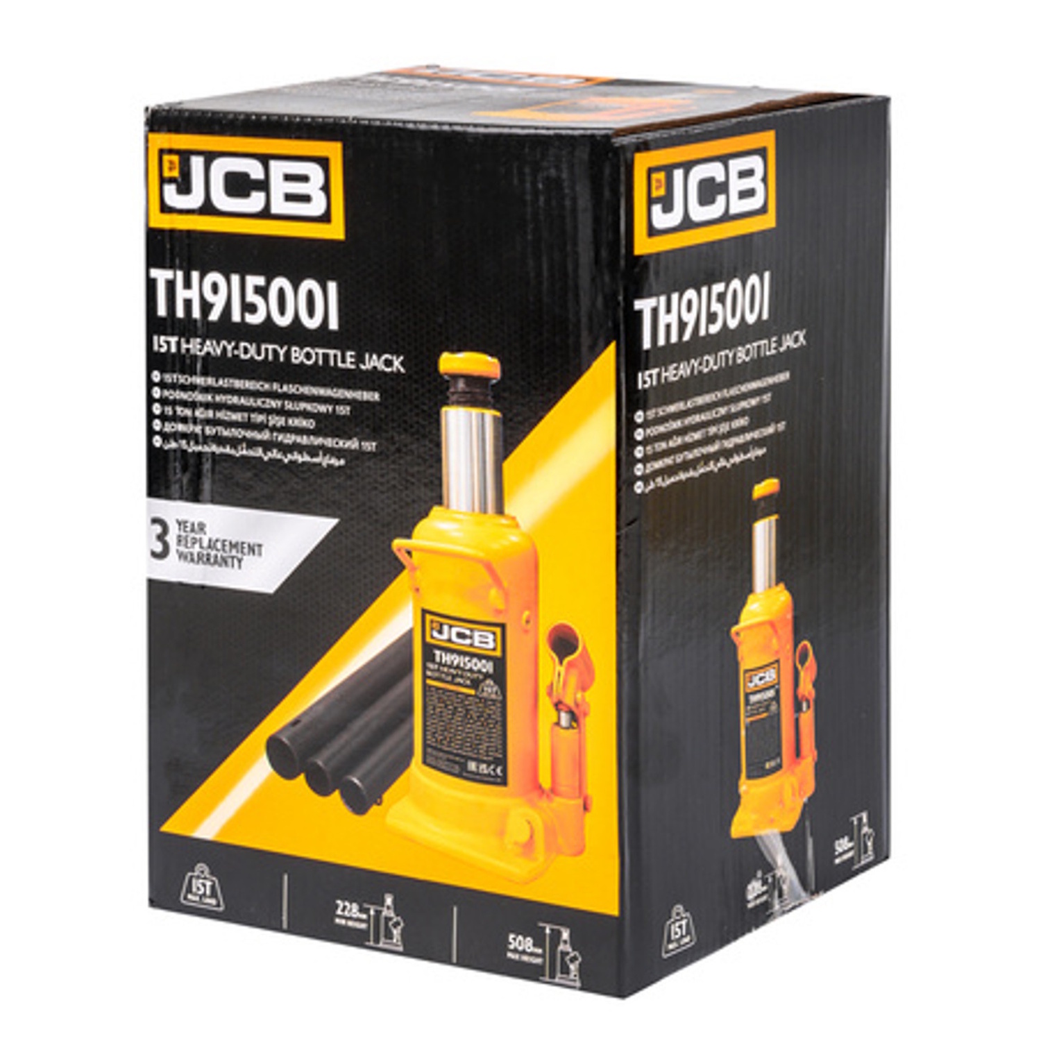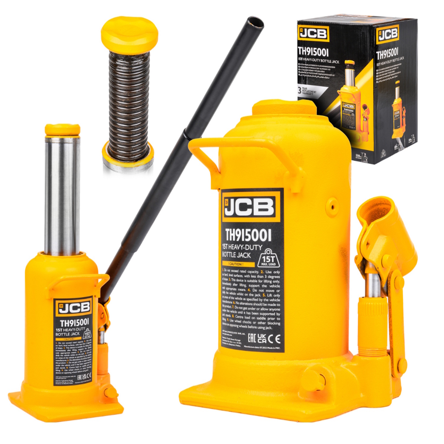 Hidraulinis butelinis domkratas iš JCB su apkrova iki 15 tonų. Tai tvirtas ir patikimas įrankis automobilių kėlimui ir išlaikymui.
