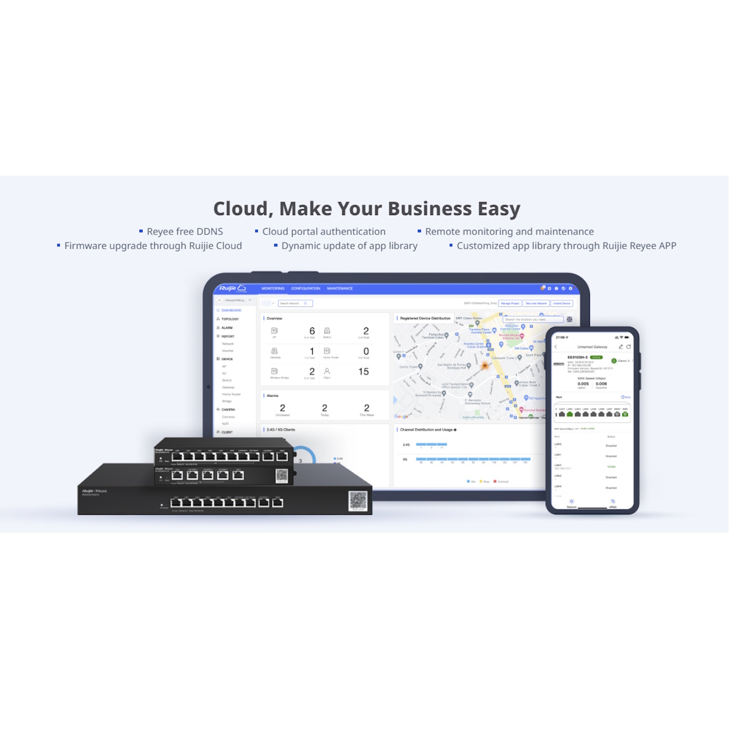 Nepriklausomai nuo to, ar maitinate IP kameras, saugiai prijungiate nuotolines šakas, ar valdote atsarginę interneto jungtį – tai įrenginys konsoliduoja viską į vieną patikimą sprendimą su debesų valdymu per Ruijie Cloud.