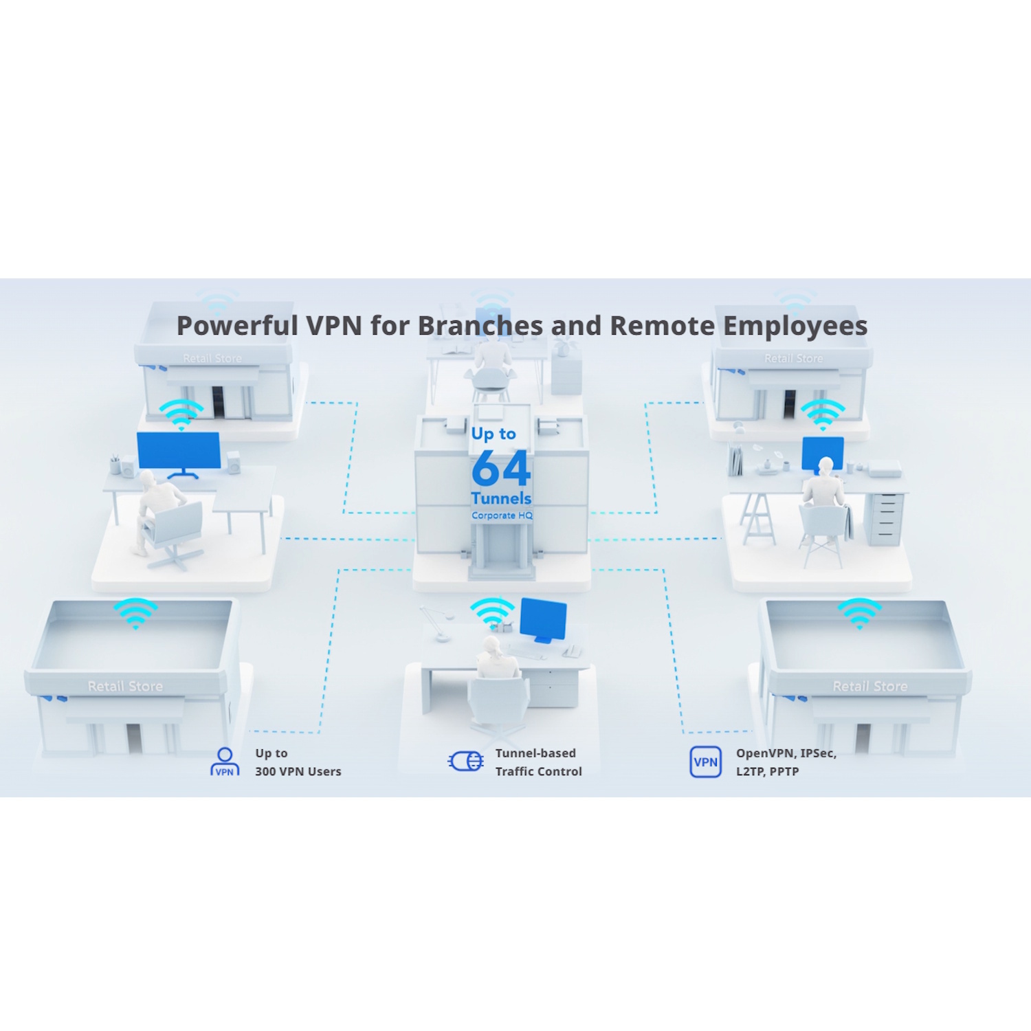 Verslo klasės VPN palaikymas IPSec, L2TP, PPTP ir OpenVPN, leidžiantis saugiai sukurti site-to-site arba nuotolinio priėjimo tunelius teleworker'ams ir šakoms.