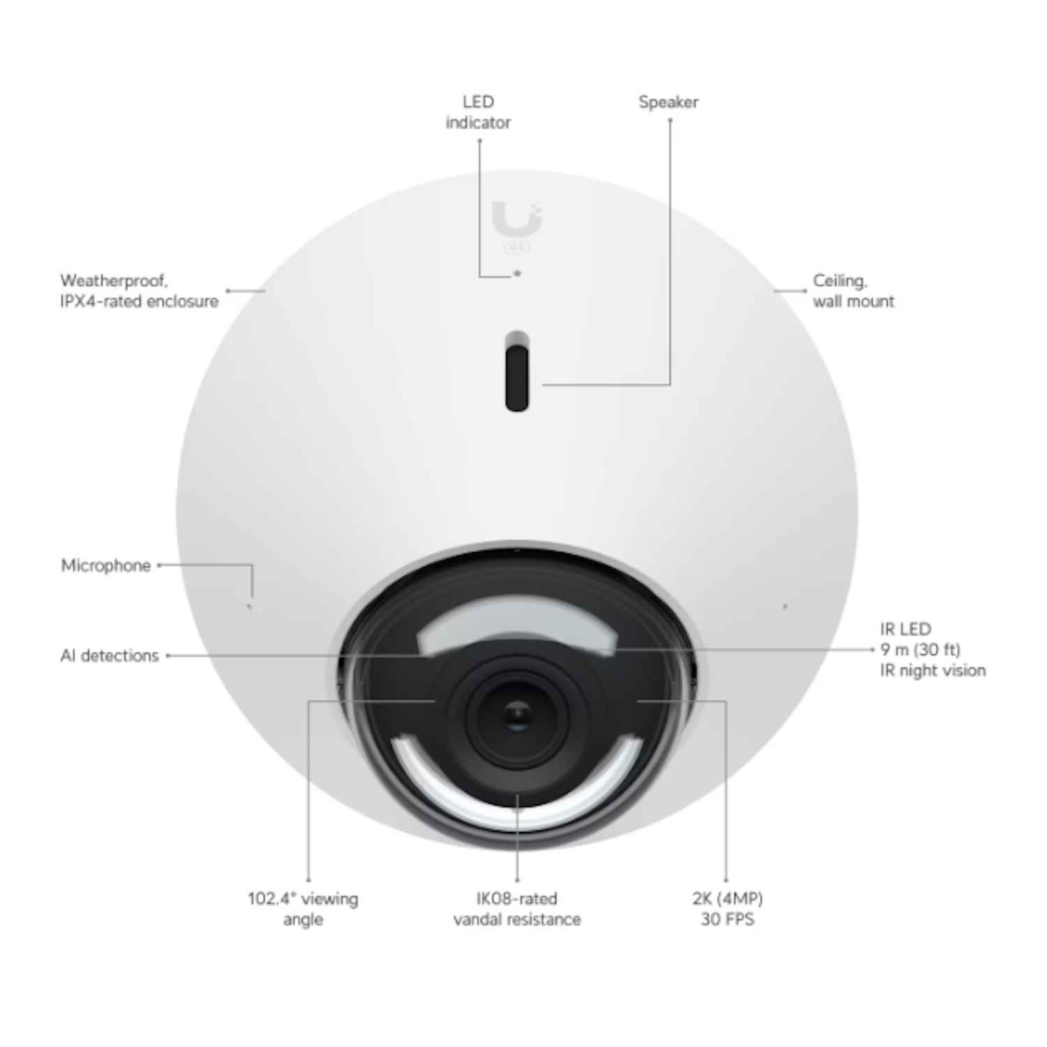 Ubiquiti UVC G5 Dome suderina keturių megapikselių raišką, platų šimtas du kablelis keturi laipsnio matymo kampą ir įrašymą iki trisdešimt frames per second, papildydama tai infraraudonųjų spindulių naktiniu matymu. Power over Ethernet supaprastina montavimą, o Gigabit Ethernet laidinė jungtis užtikrina stabilų vaizdo perdavimą profesionalioje tinklo infrastruktūroje.