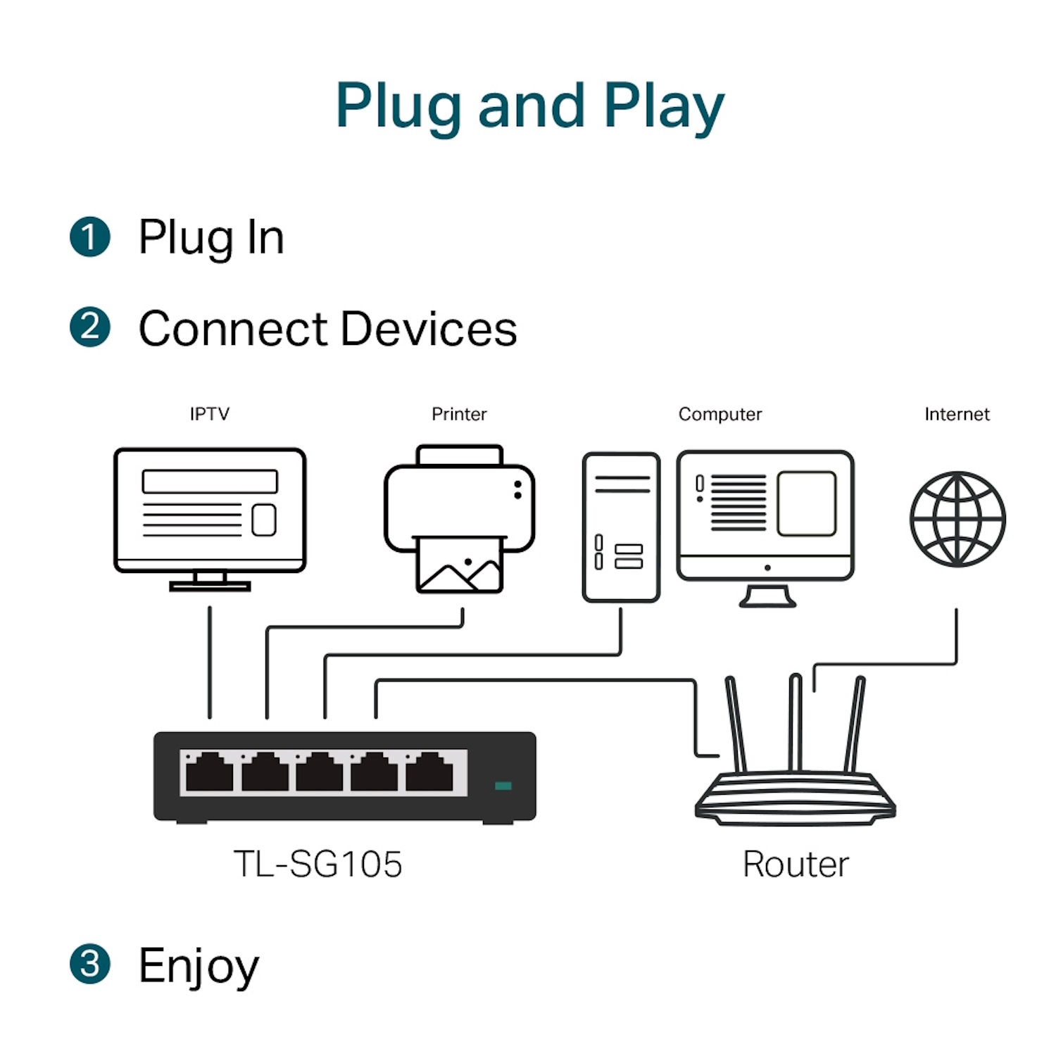 TP-Link TL-SG105 yra penkių prievadų Gigabit Ethernet tinklo komutatorius be valdymo funkcijų, skirtas greitam ir patikimam laidinio tinklo išplėtimui be konfigūracijos. Įrenginys palaiko iki vieno tūkstančio megabitų per sekundę duomenų perdavimo greitį kiekviename prievade ir automatinį kabelio tipo atpažinimą.