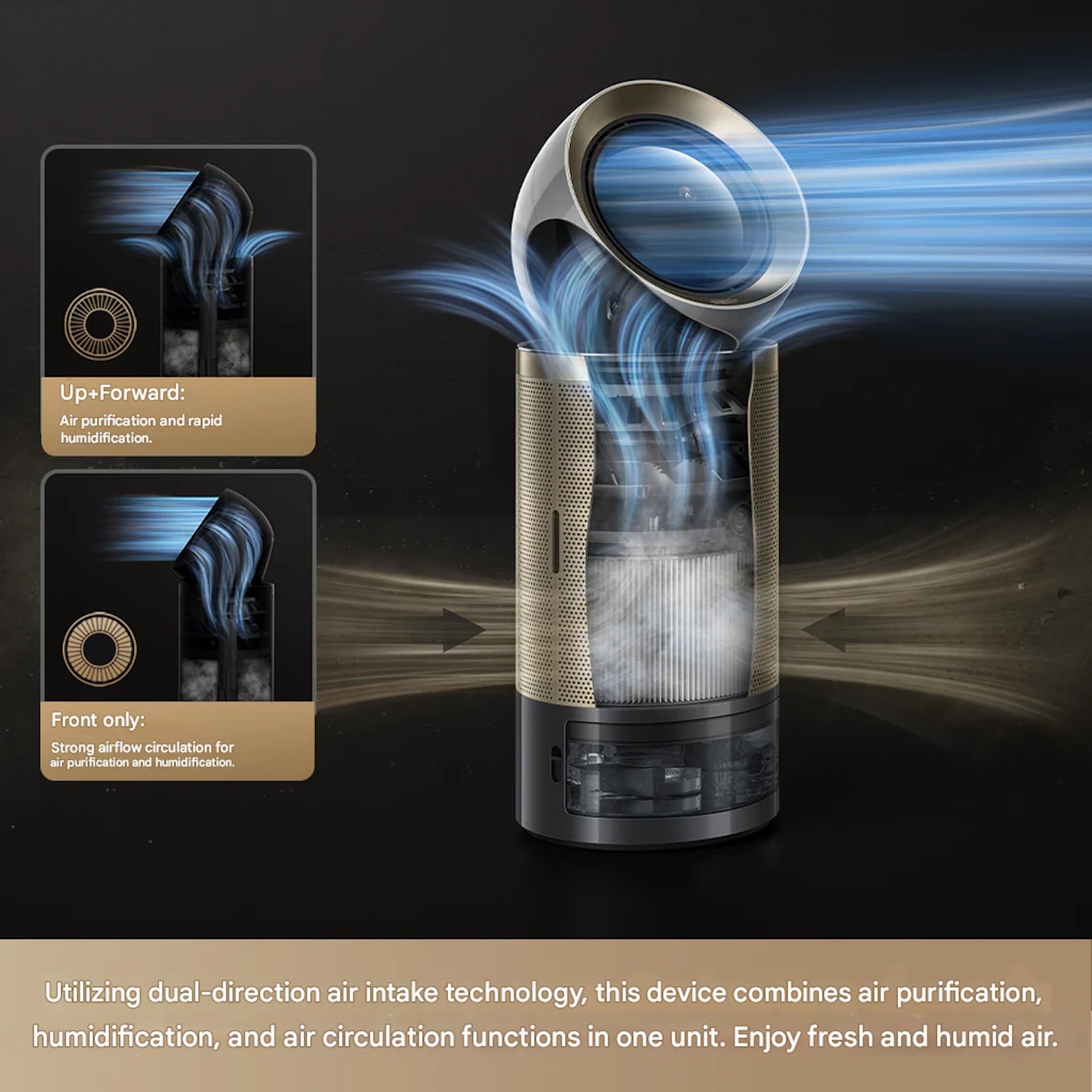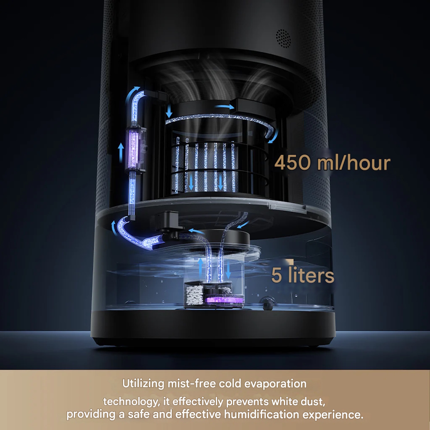 Dvigubos srovės oro cirkuliacijos sistema → tolygus oro valymas ir drėkinimas didelėse patalpose