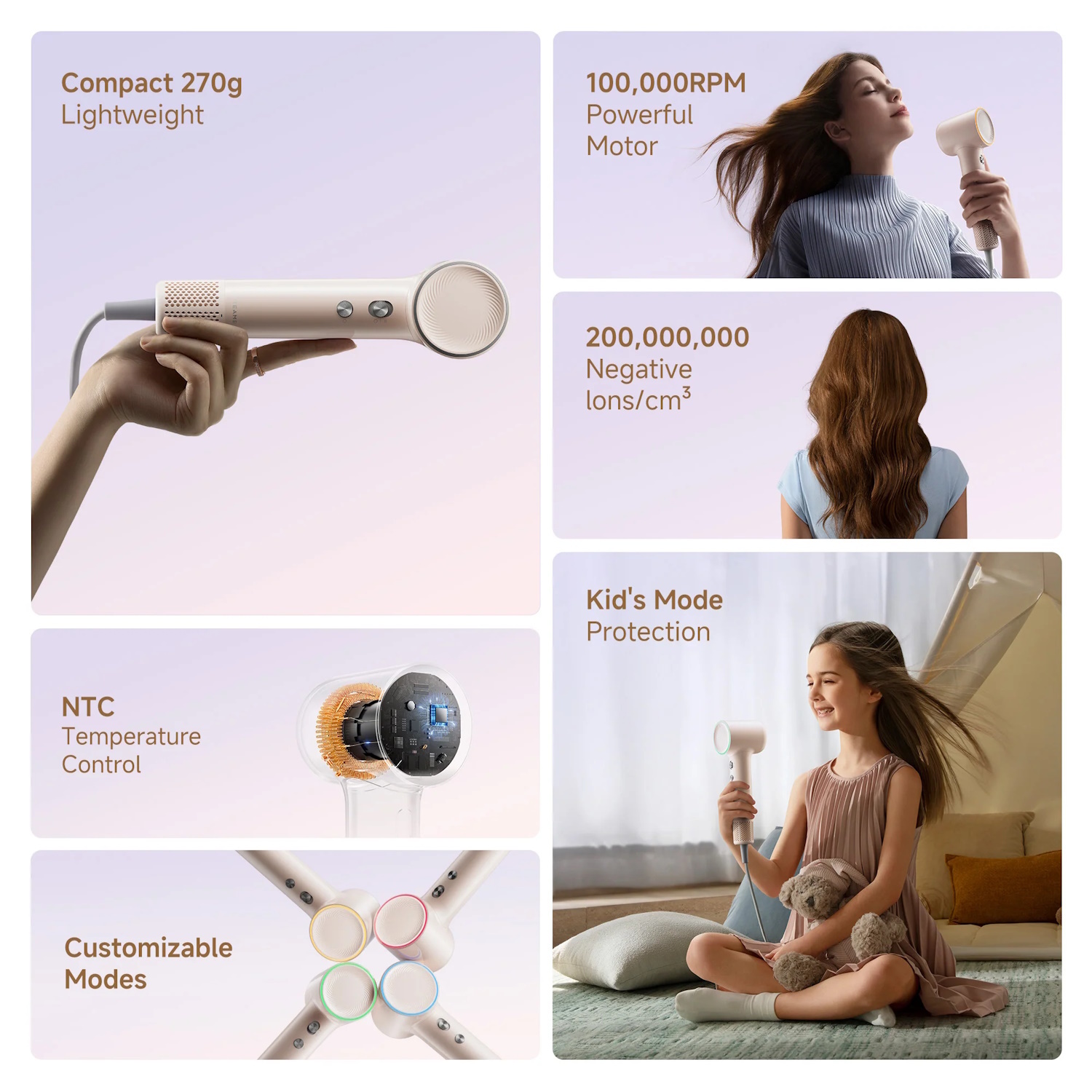 Vaikų plaukų džiovinimas su švelnia temperatūros kontrole