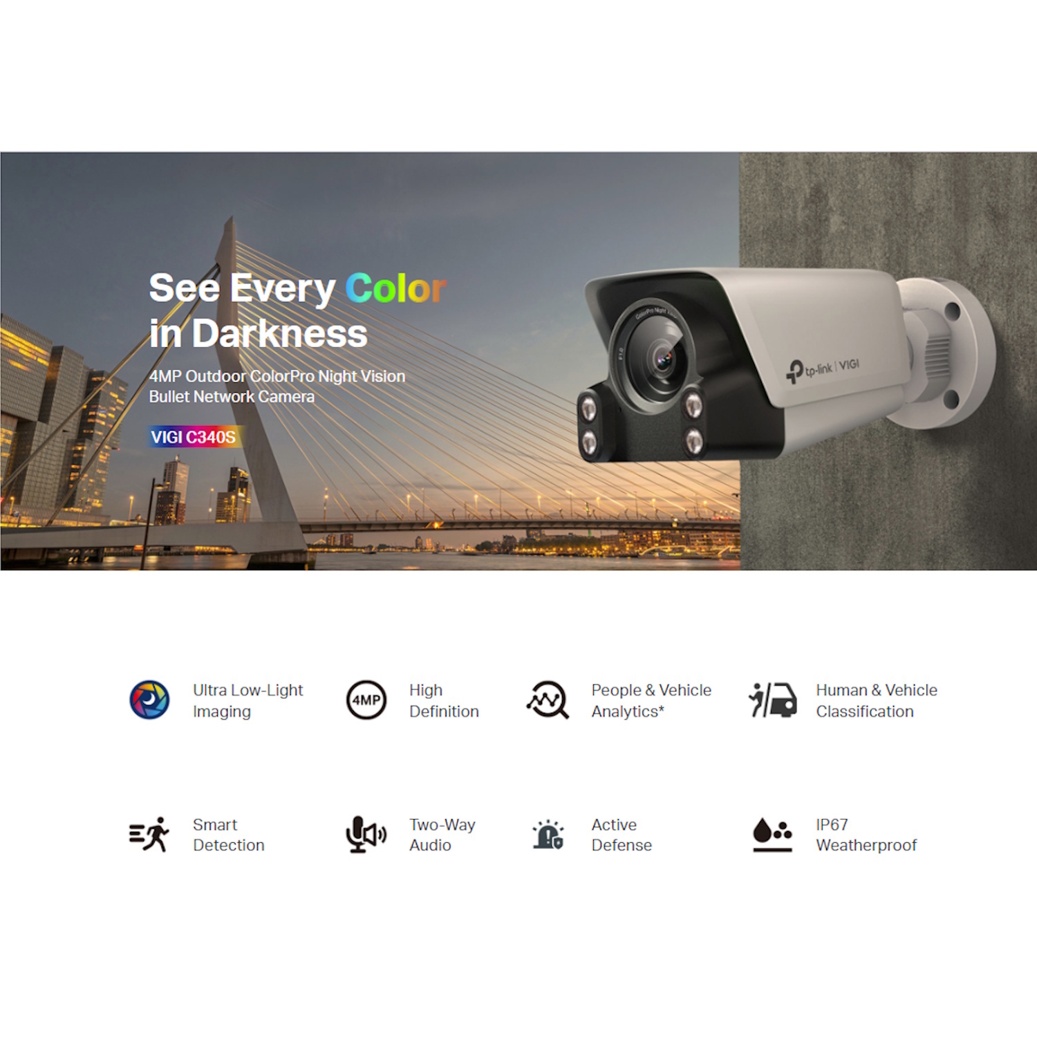 TP-Link VIGI C340S lauko IP stebėjimo kamera Full-Color ColorPro 4 MP H.265+ IP67 dvikryptis garsas VIGIC340S (4 mm) Balta