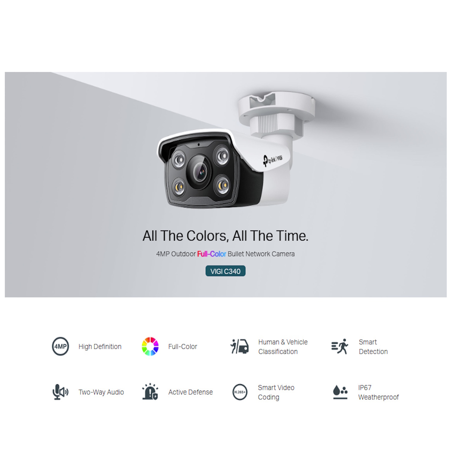 TP-Link VIGI C340 (6 mm) yra lauko „Bullet“ tipo IP stebėjimo kamera su 4 MP Super-High Definition Full-Color 24/7 vaizdu ir H.265+ vaizdo glaudinimu, užtikrinanti detalų spalvotą vaizdo įrašą dieną ir naktį, išmanų įvykių aptikimą ir dvikryptį garsą, taip pat IP67 apsaugą nuo oro sąlygų — skirta patikimai lauko saugumo stebėsenai.