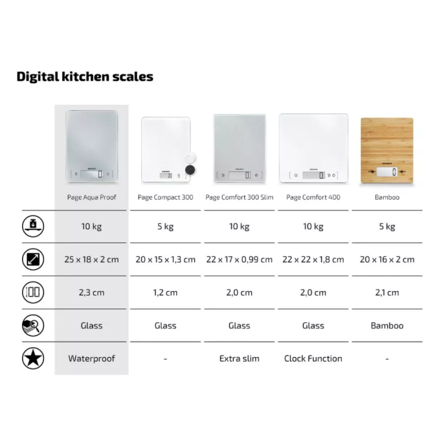 Skaitmeninės virtuvinės svarstyklės Page Aqua Proof gali būti drąsiai plaunamos indaplovėje arba po tekančiu vandeniu, nes jų korpusas yra atsparus vandeniui, sertifikuotas Vokietijos techninės kontrolės asociacijos TÜV.