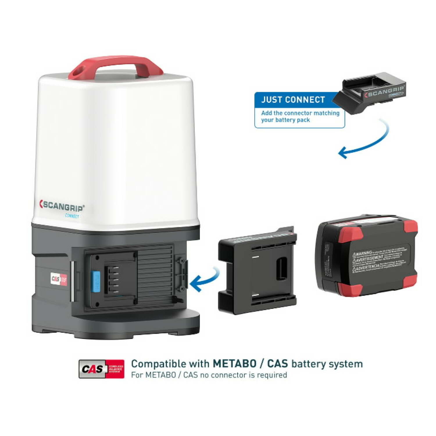 Apšvietimą galima reguliuoti nuo 360° iki 180° atsižvelgiant į darbo užduotį. AREA 10 CONNECT yra suderinama su METABO / CAS 18V akumuliatorių sistema ir kitais 18V/20V elektros įrankių gamintojų akumuliatoriais, užtikrinant didelį universalumą.