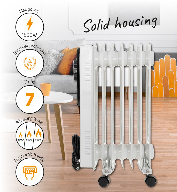 Adler AD7815 ir efektīvs un uzticams eļļas sildītājs ar 7 sekcijām un maksimālo jaudu 1500 W, kas paredzēts ~15–18 m² telpu komfortablai apsildei. Eļļas tipa radiators nodrošina vienmērīgu, sausu un maigu siltumu, saglabājot stabilu temperatūru bez trokšņiem un bez gaisa izžūšanas. Tas ir ideāls risinājums guļamistabām, bērnu istabām, darba kabinetiem un citām telpām, kur nepieciešama droša un ilgstoša apkure. Baltais korpuss ar ergonomisku dizainu ir vizuāli neuzkrītošs, viegli transportējams un aprīkots ar mehānisko jaudas regulatoru, kas ļauj pielāgot siltuma intensitāti atbilstoši telpas vajadzībām.