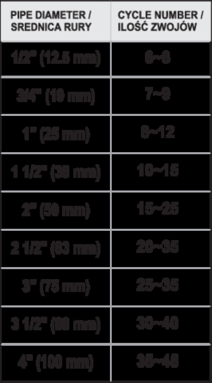 Pievienotajā tabulā ir ieteicamās ruļļu daudzumi konkrētiem caurules diametriem.