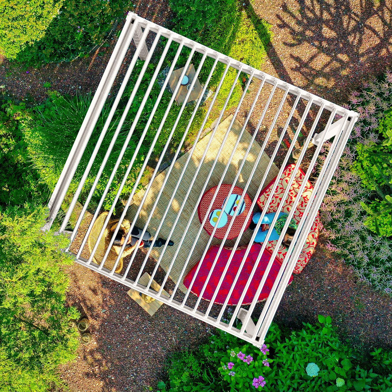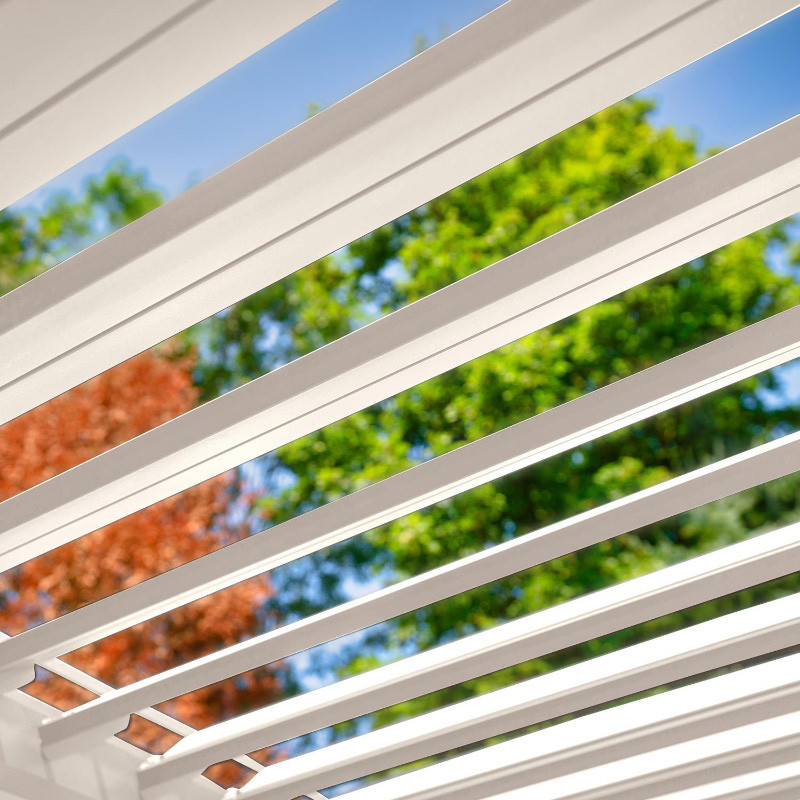 Nojume MIRADOR 3x4xH2,5m, balta. Modernā, elegantā un funkcionālā nojume/dārza paviljons iederēsies visur - dārzā, terasē, pie baseina vai kā auto nojume un to varēs izmantot visu gadu. Inovatīvais jumts ar žalūzijām ir atverams un aizvērams ar sviru, nodrošinot aizsardzību un ēnojumu no neliela lietus un svelošas saules. Ar aiztaisītajām lamelēm jumts ir pilnībā ūdensnecaurlaidīgs. Pateicoties iebūvētajai lietus ūdens sistēmai, ūdens tiek droši novadīts no jumta. Kā opciju iespējams izvēlēties atbilstošu sienu vai aizkaru veidu, tādējādi piešķirot nojumei atšķirīgu izskatu un funkcionalitāti. Cenā nav iekļautas sānu sienas un aizkari, tās jāpasūta atsevišķi. Nojumes konstrukcija ir izgatavota no alumīnija un apdarināta ar baltu pulverkrāsu. 4 atbalsta stabi 111x111mm, horizontālā sija 140x75mm, cinkota tērauda jumta žalūzijas 173x30mm. Uzstādiet nojumi uz stabilas un līdzenas virsmas un pareizi nostipriniet. Ja lietojat nojumi visu gadu, pārliecinieties, ka uz jumta nav pārāk daudz sniega. Pēc iespējas ātrāk notīriet uzkrāto sniegu. Pārliecinieties, vai ūdens novadīšanas atveres ir brīvas. Pirms ziemas sezonas sākuma pārliecinieties, ka sānu stabos/balstos nav uzkrājies ūdens. Ja ūdens sasalst, tas var sabojāt stabus/balstus.