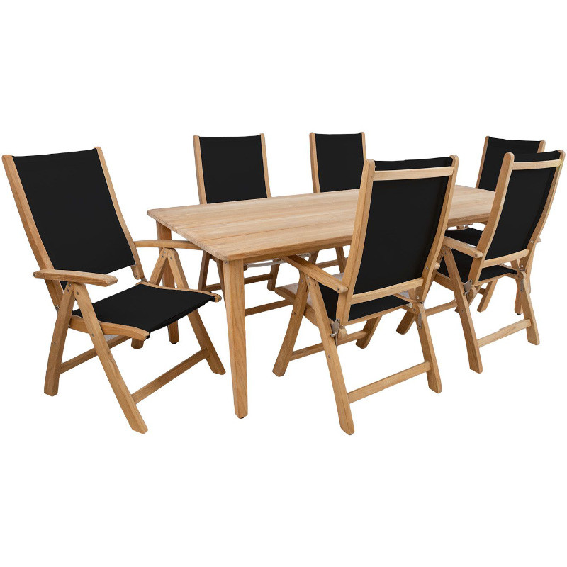 Dārza mēbeļu komplekts MALDIVE ar 6 salokāmiem krēsliem. Galda izmēri ir 220x100xH75cm. Galds ir izgatavots no rūpīgi atlasīta nobrieduša tīkkoka. Smalki slīpētā koka virsma ir pilnīgi dabiska. Pateicoties lielajam dabisko eļļu saturam, tīkkoks ir ļoti izturīgs pret mitrumu un koksnes kaitēkļiem, un tam nav nepieciešama papildu apstrāde. Krēsla kopējie izmēri ir 60x70xH110cm, sēdekļa platums 48cm, sēdekļa dziļums 46cm, sēdekļa augstums 45cm, atzveltnes augstums 70cm, roku balsta augstums no zemes 66cm. Svara ierobežojums 120kg. Krēsla rāmis ir izgatavots no tīkkoka. Visas koka daļas ir smalki noslīpētas. Sēdeklis un atzveltne ir izgatavoti no melna batilīna. Batilīna materiāla svarīgākā īpašība ir tā elastība un optimāls sēdēšanas komforts. Papildus izcilajai mehāniskajai izturībai materiālam ir augsta ķīmiskā izturība. Sintētiskais pārklājums garantē īpaši augstu laikapstākļu un UV noturību. Tas, ka netiek absorbēts mitrums, nodrošina ātru žūšanu, maksimālu noturību pret traipiem un pelējumu, kā arī vienkāršu tīrīšanu. Lai noregulētu atzveltni, paceliet roku balstus, izvēlieties atbilstošo atzveltnes pozīciju un nofiksējiet roku balstus. Ir iespējams izvēlēties starp 6 dažādām pozīcijām. Tīkoka koksne ļoti labi panes dažādus laikapstākļus un saglabā savu lielisko izskatu un labākās īpašības daudzus gadus. Jo nobriedušāka koksne, jo augstāks tās blīvums un eļļas saturs, kā arī izturīgāka un noturīgāka pret laikapstākļiem. Saules gaismas un mitruma ietekmē koka virsma ar laiku kļūst skaisti sudrabaini pelēka. Šī krāsas maiņa ir dabiska un neietekmē koksnes kvalitāti. KOPŠANA: regulāri tīriet mēbeles, sargājiet tās no pārmērīga mitruma un UV starojuma. Lai atsvaidzinātu koka virsmas, pēc vēlēšanās tās var viegli noslīpēt. Lai pagarinātu āra mēbeļu kalpošanas laiku, iesakām izmantot āra mēbeļu pārvalkus. UZGLABĀŠANA: vasaras sezonas beigās iesakām dārza mēbeles uzglabāt iekštelpās. Pirms glabāšanas notīriet un nosusiniet mēbeles. Glabāšanai izmantojiet vēsu, sausu, labi vēdināmu telpu.