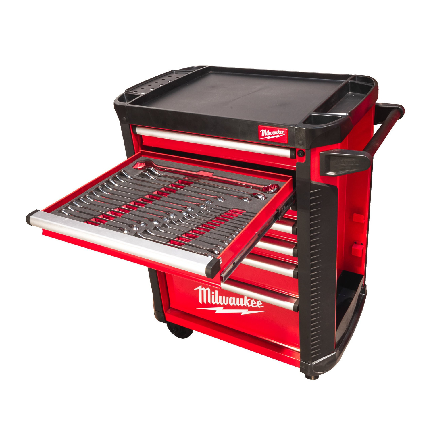 5 atvilktnes, kas piepildītas ar svarīgākajiem automobiļu apkopei nepieciešamajiem darbarīkiem, kas glīti ievietoti putuplasta ieliktņos, lai nodrošinātu vislabāko organizāciju.