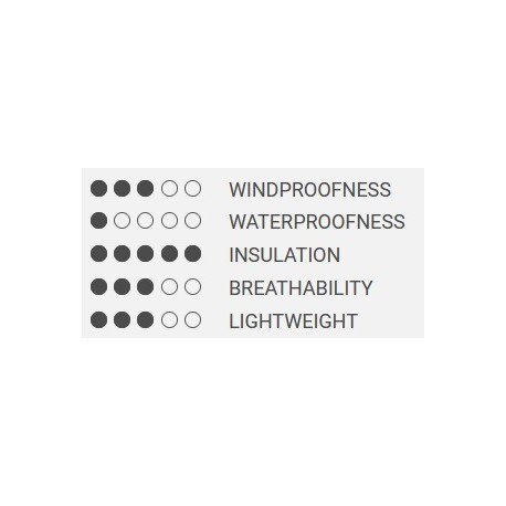Pilnīga vēja aizsardzība, saglabājot labas materiāla elpošanas īpašības. Tiek samazināts pārkaršanas risks un mitruma uzkrāšanās apģērba iekšpusē. DWR (mitrumu atgrūdošs) pārklājums ārpusē.