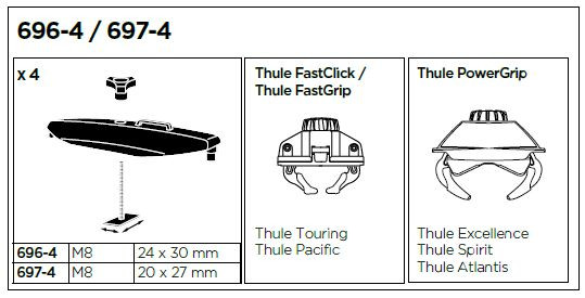 Aizvieto standarta Thule jumta kastes montāžas sistēmas Fast-Grip un Power-Grip.