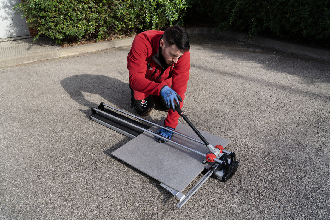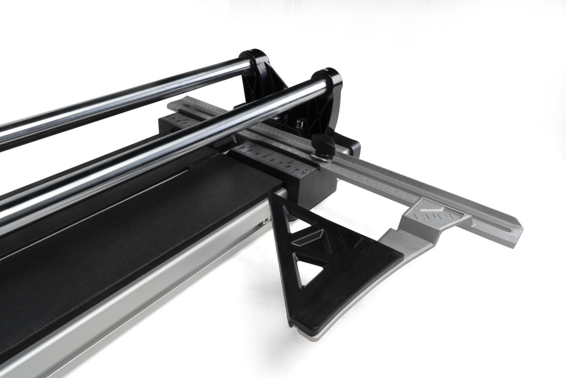 Profesionāls divu vadotņu keramikas flīžu griezējs ar daudzpunktu separatoru un fiksētu kvadrātu. Ideāli piemērots biežai porcelāna akmens materiāla griešanai un intensīvai flīžu un glazētu akmens materiālu griešanai. Bi-materiāla pamatne ar 2 mm biezumu gumijas slāni nodrošina izcilu izturību un pretestību keramikas berzei. Mīksta roktura dizains nodrošina lielāku ergonomiku un komfortu. Fiksēts kvadrāts ar alumīnija sānu apstāšanās elementiem atkārtotiem griezumiem un šaurām joslām ar divkāršu mērogu (mm un collas) un pastiprināts plastmasas fiksēts kvadrāts 45° griezumiem. Divi integrēti papildu rokas elementi nodrošina lielāku stabilitāti lielformāta keramikai. 05/16" (8 mm) sudraba griešanas ritenis iekļauts. Daudzpunktu separators izgatavots no die-cast alumīnija, ar magnētisko pārtraukšanas mehānismu ātrākai lietošanai. Separatora bloķēšana un atbloķēšana griešanai un atdalīšanai tiek veikta ar vienu roku. Viegls un izturīgs griezējs, pateicoties ekstrudētās alumīnija pamatnes, ar atvērtu profilu un tērauda ribu pastiprinājumu.