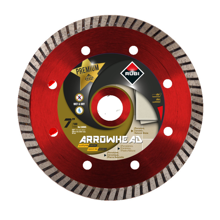 RUBI ARROWHEAD dimanta asmeņi mitrai griešanai porcelāna flīzēm ir īpaši izstrādāti, lai nodrošinātu labāko veiktspēju keramikas flīžu uzstādīšanas profesionāļiem. ARROWHEAD dimanta asmens ir īpaši ieteicams taisniem griezumiem porcelāna flīzēs, īpaši darbos, kuros nepieciešama augsta griešanas ātruma saglabāšana, neupurējot veiktspēju un kvalitāti. Tā nelielā biezuma dēļ RUBI ARROWHEAD asmens nav ieteicams leņķa griezumiem. Griezšana ļoti cietām porcelāna flīzēm ir prasīgs uzdevums, gan materiālam, gan asmenim, un, protams, arī lietotājam. Tādēļ, pateicoties J-SLOT tipam, RUBI ARROWHEAD asmens palielina griešanas ātrumu ļoti cietām porcelāna flīzēm, samazinot griešanas laikā radītās spriedzes. Tādējādi tiek nodrošināta gan ātruma, gan veiktspējas saglabāšana, un taisni griezumi porcelāna flīzēs tiek ievērojami atviegloti. Ar lāzera metināšanu mēs esam nodrošinājuši kvalitāti un drošību lietotājam, izveidojot savienojumu starp dimanta malu un tērauda kodolu RUBI ARROWHEAD asmenī. Ieteicams smalkiem griezumiem porcelāna flīzēs. Augsta tehnoloģija. Augsts ātrums taisnā griešanā porcelāna flīzēs. Tikai taisniem griezumiem, nav piemērots leņķa griezumiem. Īpaši izstrādāts savienojumam ar 5/8 collu vārpstu. Asmeņi ar biezumu mazāk par 5/64 collām nav piemēroti leņķa griezumiem. Pateicoties visu uzņēmuma departamentu darbam un sadarbībai, kā arī mūsu klientu uzticībai visā pasaulē, mēs apzināmies katra tirgus prasības un specifiskās vajadzības. Tādēļ mēs izstrādājam un ražojam produktus un rīkus, kas pielāgoti katra tirgus tipam un atbilst profesionāļu vajadzībām.
