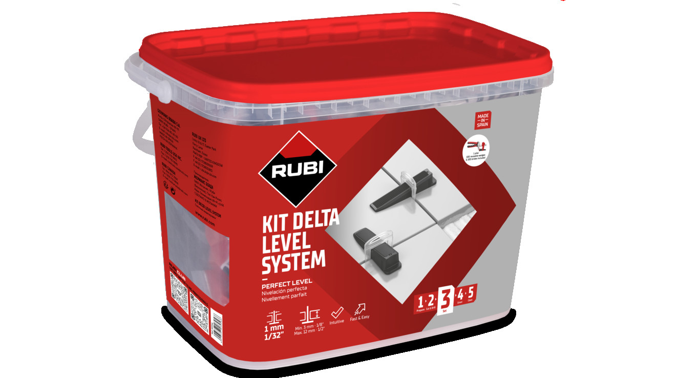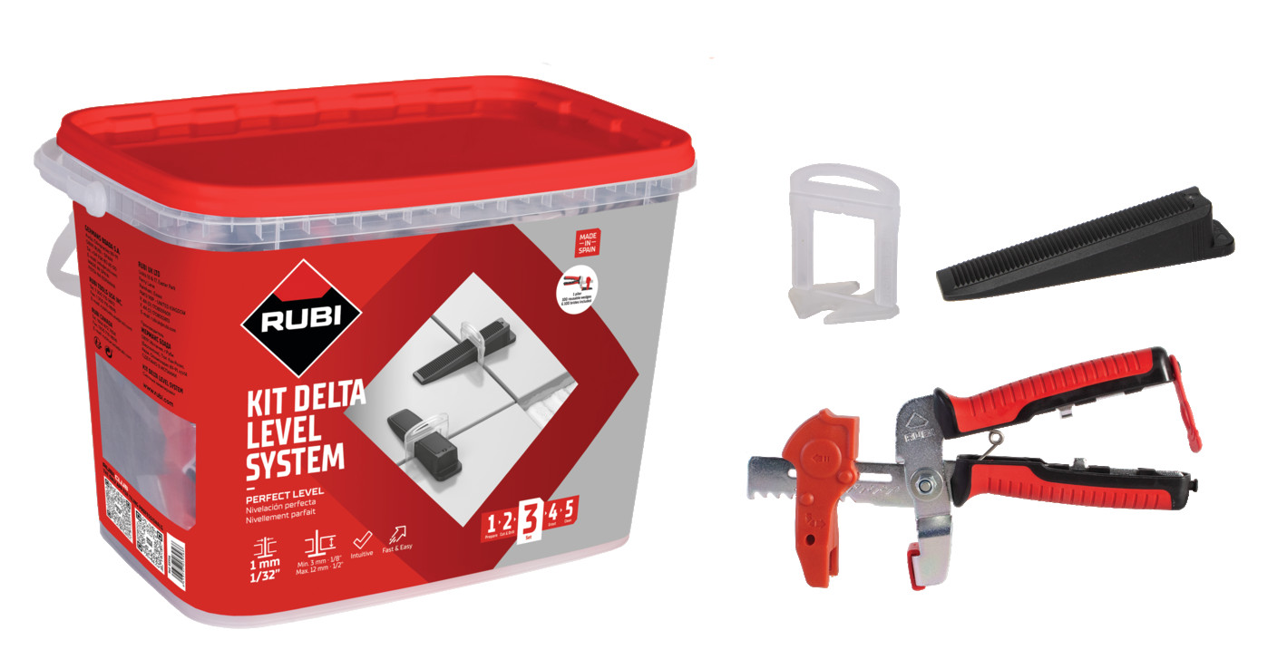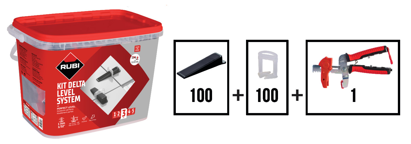 RUBI DELTA FLĪŽU LĪMEŅOŠANAS SISTĒMAS komplekts ietver: 1 knaibles, kas piemērotas gan grīdu, gan sienu flīzēm (horizontālo un vertikālo flīžu uzstādīšanai), 1 soma ar 100 vienībām sloksnēm, kas piemērotas keramikas flīzēm ar biezumu no 1/8” līdz 1/2", un 1 soma ar 100 vienībām atkārtoti izmantojamu vīlēm. Visi RUBI DELTA FLĪŽU LĪMEŅOŠANAS SISTĒMAS komponenti ir iekļauti praktiskā spainī ar rokturi, kas nodrošina ērtu lietošanu un transportēšanu. Šo spaini var atkārtoti izmantot, nomainot sloksnes vai bojātās vai pazaudētās vīles, kā arī tajā var uzglabāt knaibles līdz nākamajai lietošanai. RUBI DELTA FLĪŽU LĪMEŅOŠANAS SISTĒMA ir ideāla lielformāta keramikas flīžu (minimālais izmērs: 12”x12”) ieklāšanai, izmantojot aizmugurējo sviestmaizes tehniku. DELTA FLĪŽU LĪMEŅOŠANAS SISTĒMA novērš detaļu kustību, kad līme sacietē, un uzlabo iegūtās virsmas līdzenumu. Pateicoties DELTA sistēmai, profesionālais uzstādītājs redz, kā tiek samazināts darba laiks un uzlabojas uzstādīšanas darbu rentabilitāte, gan grīdu, gan sienu flīzēm. DELTA FLĪŽU LĪMEŅOŠANAS SISTĒMA tika izstrādāta, lai ietaupītu laiku lielformāta flīžu uzstādīšanā, īpaši taisnās porcelāna flīzēs, kā arī lai nodrošinātu perfektu uzstādīšanu un līmeņošanu ar jebkuru materiālu un izmēriem. Spiediens, ko rada DELTA flīžu vīles, pateicoties sloksnēm un knaiblēm, padara to par lielisku risinājumu, lai ietaupītu laiku un iegūtu labākos rezultātus keramikas flīžu uzstādīšanā. RUBI apzinās efektivitātes un laika taupīšanas nozīmi, tāpēc mūsu produktu attīstības vadītāji ir ļoti koncentrējušies uz šiem jēdzieniem, izstrādājot jaunus rīkus.