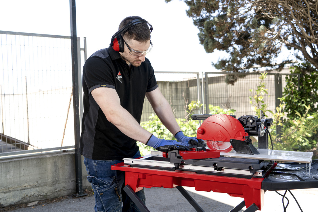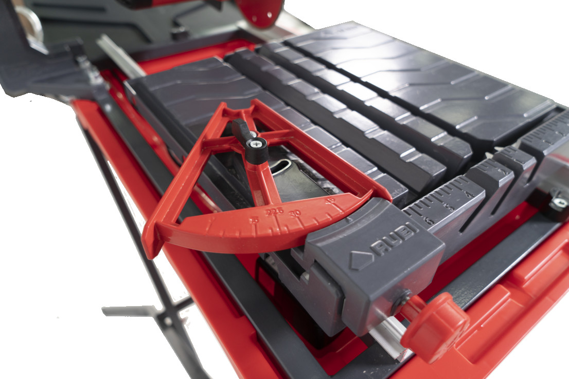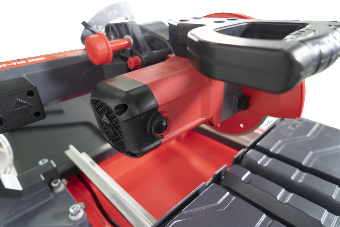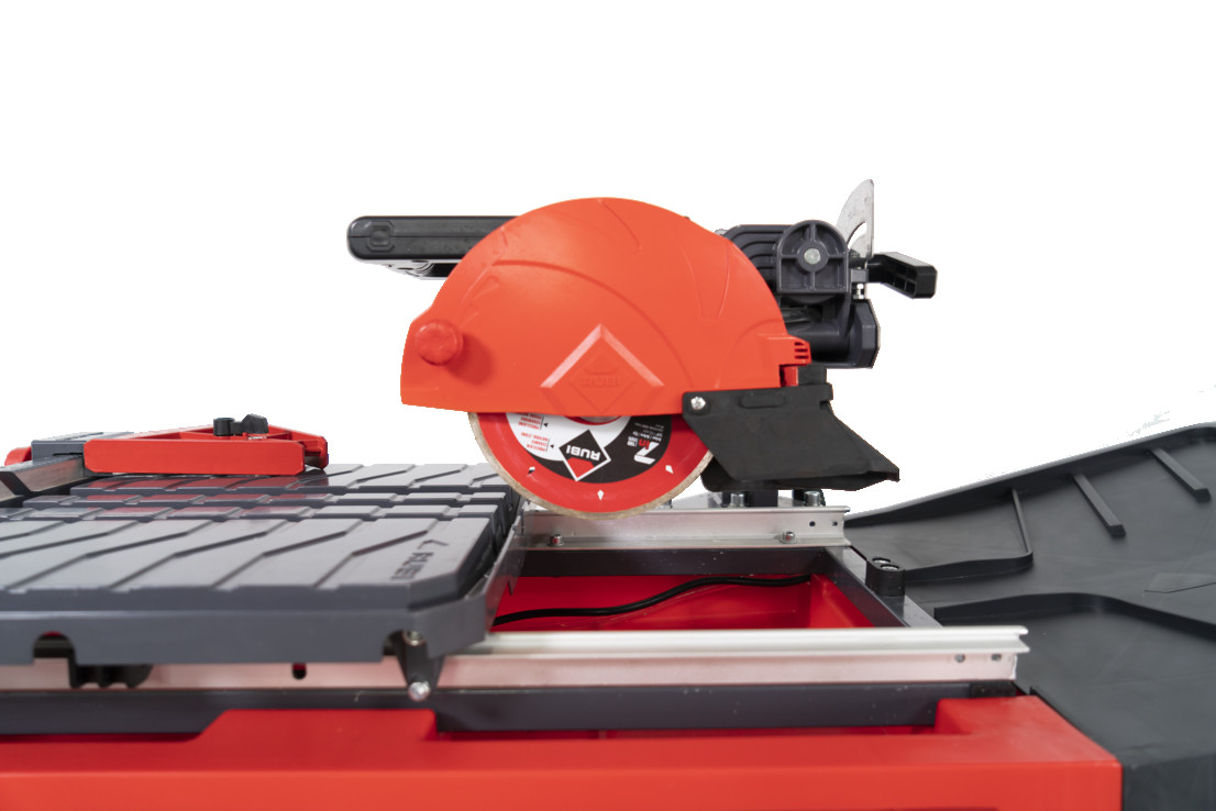 RUBI DT-7IN MAX elektriskais flīžu griezējs ir mobilais PRO griezējs, kas piemērots jebkura veida keramikas flīžu, kā arī dabīgā vai sinterētā akmens griešanai. Tā izmēri padara DT-7IN MAX par ideālu elektrisko griezēju remontdarbiem. DT-7IN MAX ir aprīkots ar 10A universālo motoru un mobilu griešanas galvu, kas ļauj pielāgot griešanas augstumu atbilstoši materiāla vajadzībām. Galva ir salokāma 22,5º un 45º leņķī, ļaujot veikt mitru griezumus uz vietas. DT-7IN MAX dizains ietver kustīgu galdu ar maksimālo griešanas garumu līdz 24 collām, kas atbilst maksimālajai formāta diagonālei 18 collas un maksimālajai griešanas biezumam 2 1/4 collas. Mobilais galds ir izgatavots no alumīnija, kas nodrošina lielāku izturību (pretestību oksidācijai) un vieglumu. DT-7IN MAX ir aprīkots ar praktisku sānu atbalstu, kas atvieglo materiāla fiksēšanu, veicot atkārtotus griezumus. Ierīce ietver sistēmu, kas optimizē diska dzesēšanu, pagarinot tā kalpošanas laiku un samazinot ūdens zudumus. Mēs esam palielinājuši aizmugurējā trauka ietilpību, kas ne tikai ļauj strādāt tīrākā vidē, bet arī palielina ūdens atkārtotu izmantošanu, samazinot laiku, kas nepieciešams 4,27 galonu tvertnes uzpildei. DT-7IN MAX standarta komplektācijā ietilpst 7 collu ARROWHEAD premium asmens, kas īpaši paredzēts porcelāna flīžu griešanai. Vieglā 47 mārciņu svars padara DT-7IN MAX viegli transportējamu, pateicoties salokāmajam statīvam ar izturīgu tērauda struktūru un praktisko modularitāti. Šo mašīnu var viegli sadalīt trīs atsevišķās daļās: statīvā, ūdens traukā un griezēja rāmī.