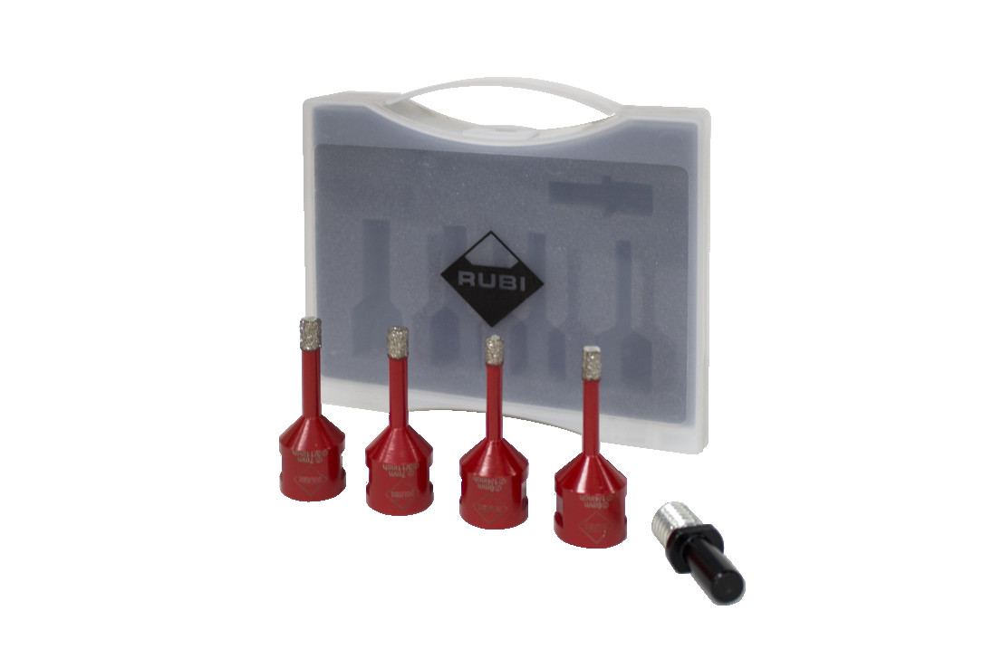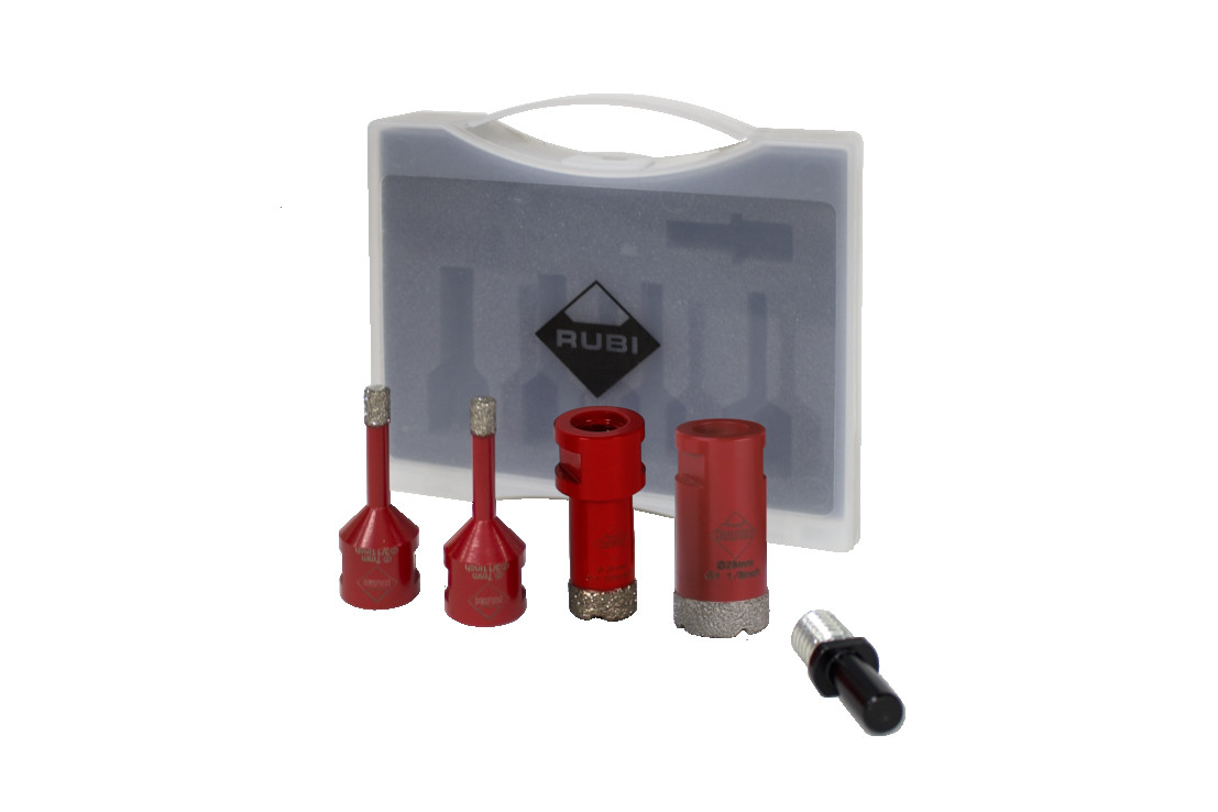 DRYGRES komplekti ir visekonomiskākais risinājums lietotājiem, kuriem nepieciešams veikt sausos urbšanas darbus ar dažādiem diametriem un jebkura veida keramikas flīzēm. DRYGRES dimanta urbji ir ieteicami visiem keramikas flīžu veidiem, īpaši porcelāna flīzēm, kā arī citiem sienu materiāliem, piemēram, marmoram un granītam. DRYGRES urbju klāstā RUBI ir izmantojusi vakuuma lodēšanas tehnoloģiju, kas palielina izturību pret temperatūru un berzi, nostiprinot dimanta daļiņas griešanas zonā. RUBI piedāvā komplektus dažādās konfigurācijās, vienmēr cenšoties nodrošināt profesionāļiem vispiemērotāko risinājumu. DRYGRES komplekti galvenokārt ir paredzēti keramikas flīžu uzstādītājiem, lai iegūtu labākos rezultātus, veicot nepieciešamos urbšanas darbus ūdens pievadiem, kanalizācijai, elektriskajām savienojumiem utt. DRYGRES komplektā ietilpst: -MULTIDRILL vadotne. -28, 35, 43 un 68 mm dimanta urbji (ref. 50917). -28, 35, 43, 50 un 68 mm dimanta urbji (ref. 50936). -6, 8, 20, 35, 50 un 68 mm dimanta urbji (ref. 50996). -6 (x2), 20, 35 mm dimanta urbji un TCR-115 SUPERPRO dimanta asmens (ref. 68923). -Kaste. DRYGRES dimanta urbji ir paredzēti sausai griešanai un var tikt izmantoti, pateicoties M14 vītnei, tieši ar slīpmašīnu vai neperkusīvu elektrisko urbi, izmantojot urbja adapteri (ref. 05976). Vidējais DRYGRES 20-75 mm urbju kalpošanas laiks ir 60 caurumu. Urbju kalpošanas laiks vienmēr ir atkarīgs no materiāla veida, tā biezuma, pareizas dzesēšanas un lietošanas. DRYGRES urbju urbšanas dziļums ir 36 mm. DRYGRES urbjiem (diametri 20-75 mm) ir sānu atvere, kas uzlabo urbja dzesēšanu un atvieglo cietu atlikumu noņemšanu pēc katra urbšanas procesa. Pirms turpmākas urbšanas ir jāpārliecinās, ka urbis ir tīrs un bez šķēršļiem. Maksimālā lietošanas ātrums DRYGRES dimanta urbjiem ir 14000 apgr./min. Lai nodrošinātu labāku apdari un ilgāku urbja kalpošanas laiku, ir svarīgi ievērot pareizo rotācijas ātrumu un veikt tikai nelielu orbītu urbšanas laikā.