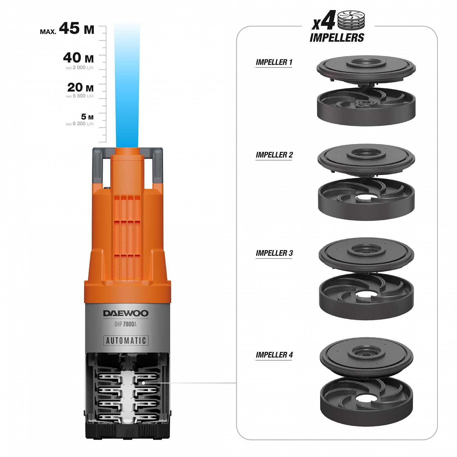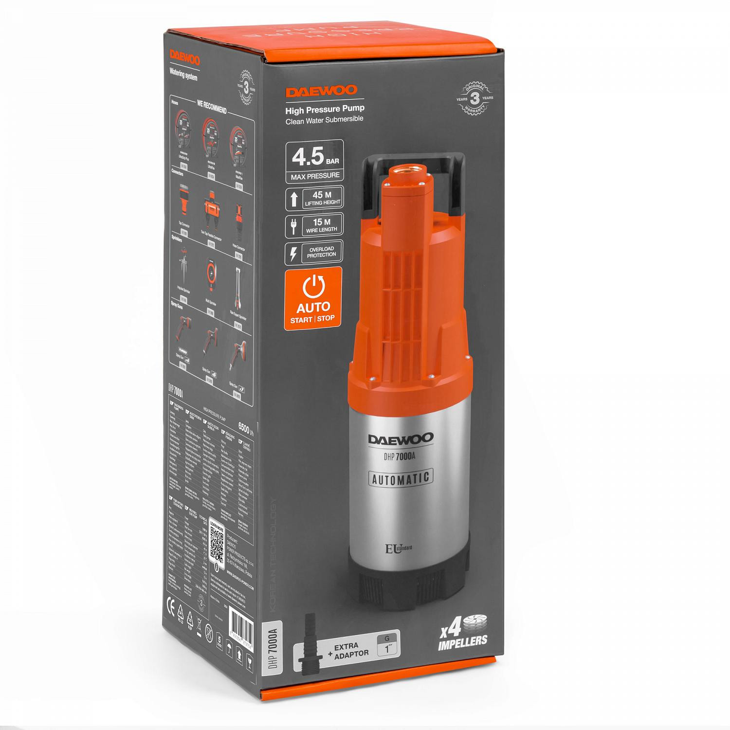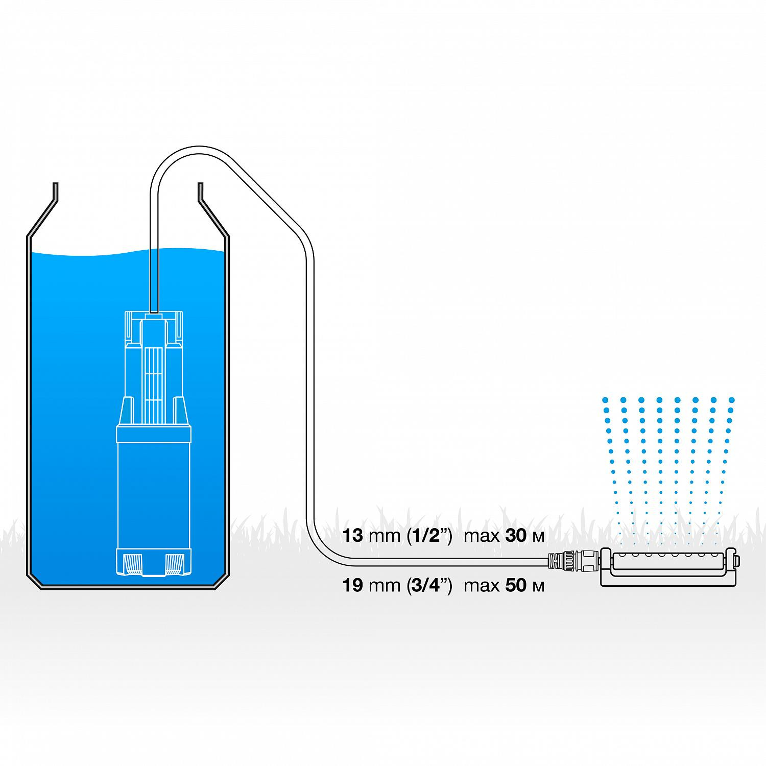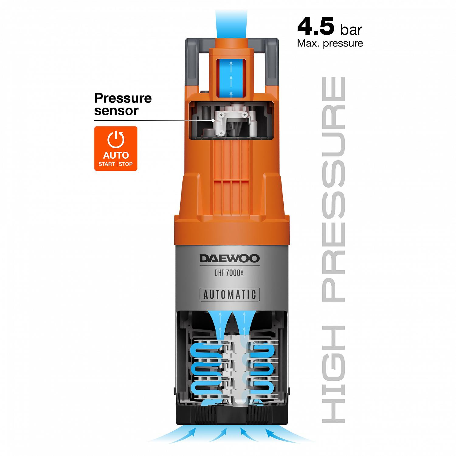 Sūkņa motora jauda ir 1000 W, tā ļauj radīt spiedienu līdz 4,5 bāriem, kas ir pietiekams, lai savienotu vairākus laistītājus. Lieliski piemērots laistīšanas organizēšanai no akas vai dziļurbuma.