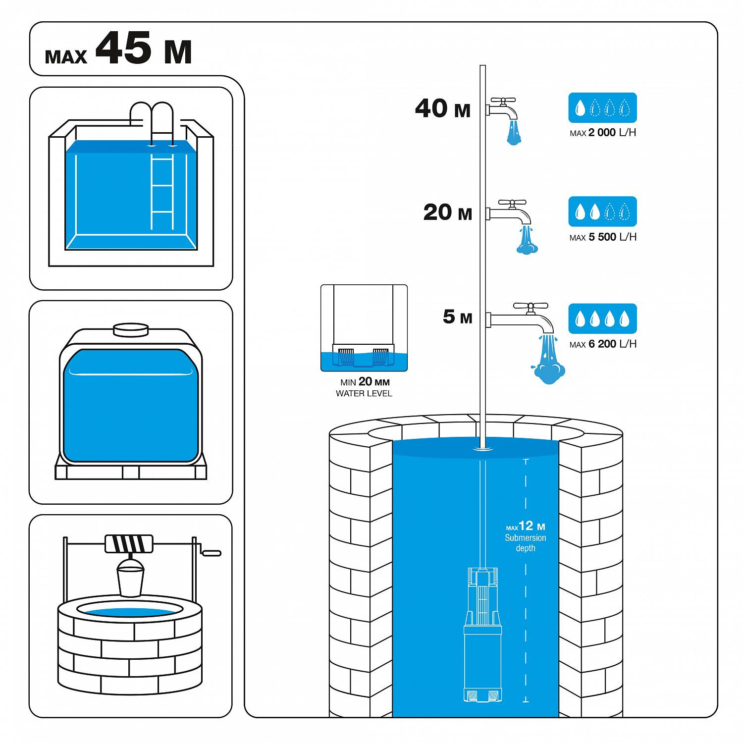 | Ūdens sūkņa iegremdēšanas dziļums, m | 12 |