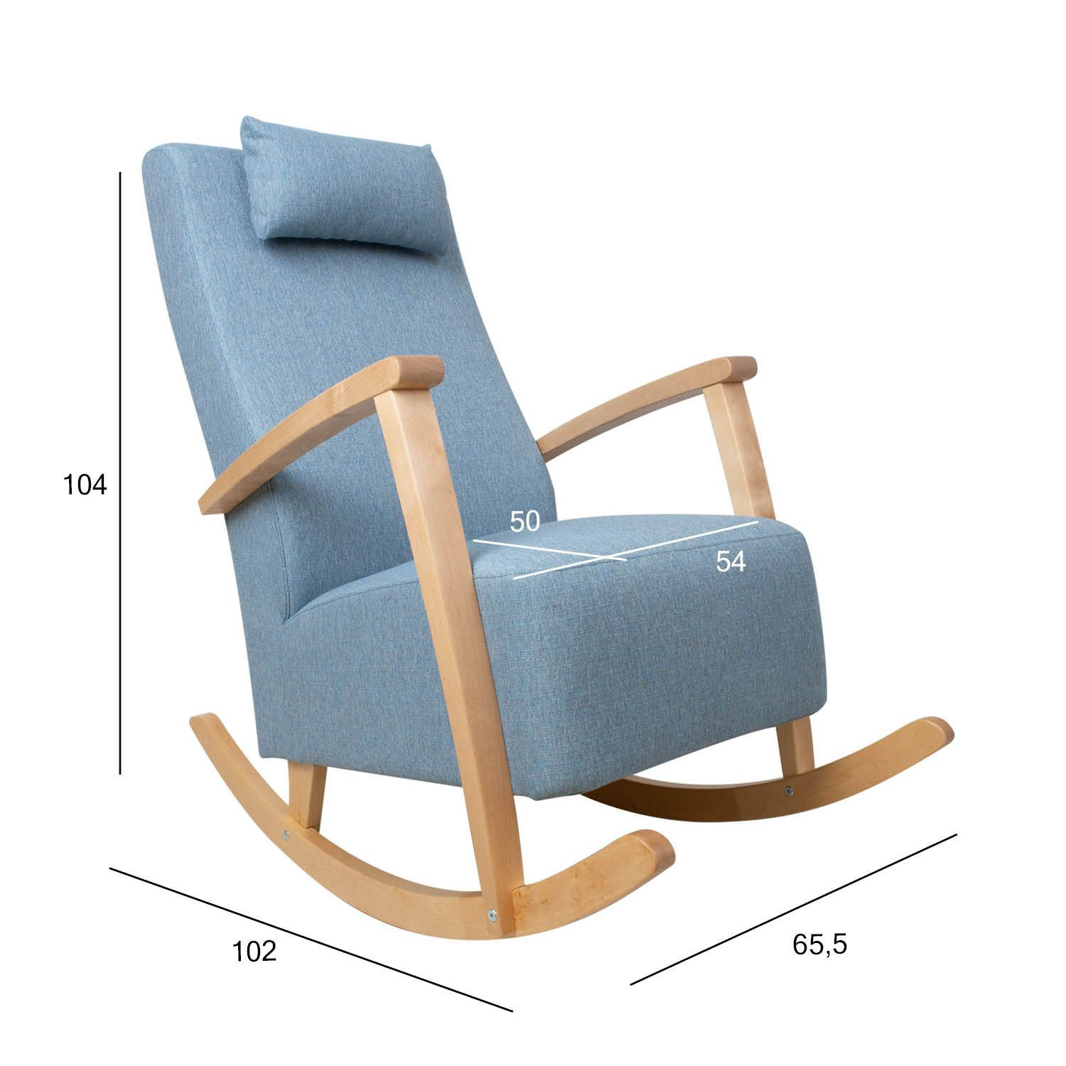 Mazais papildu spilvens uz galvas balsta ir noņemams un tā augstums regulējams. Spilvena pārvalks ir noņemams un mazgājams. Šūpuļkrēsla kopējie izmēri ir 65,5x102xH104cm. Sēdekļa platums 54cm, sēdekļa dziļums 50cm. Atzveltnes augstums 77cm. Roku balsta augstums no sēdekļa ir 23cm.