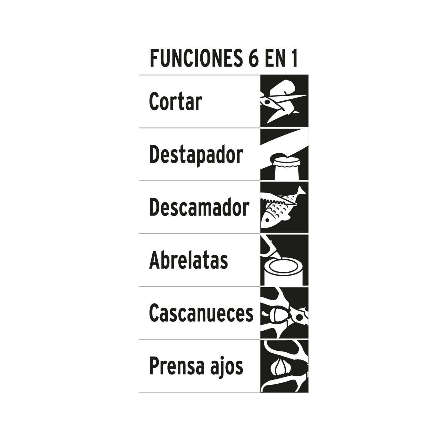 Šīs šķēres ir izgatavotas no nerūsējošā tērauda, kas nodrošina lielāku izturību pret koroziju. Ergonomiskie rokturi ar TPR pret slīdēšanu nodrošina ērtu lietošanu. Multifunkcionālas - 6 funkcijas vienā: griešana, pudeļu atvēršana, mizotājs, konservu atvērējs, riekstu šķēlējs un ķiploku spiedējs.